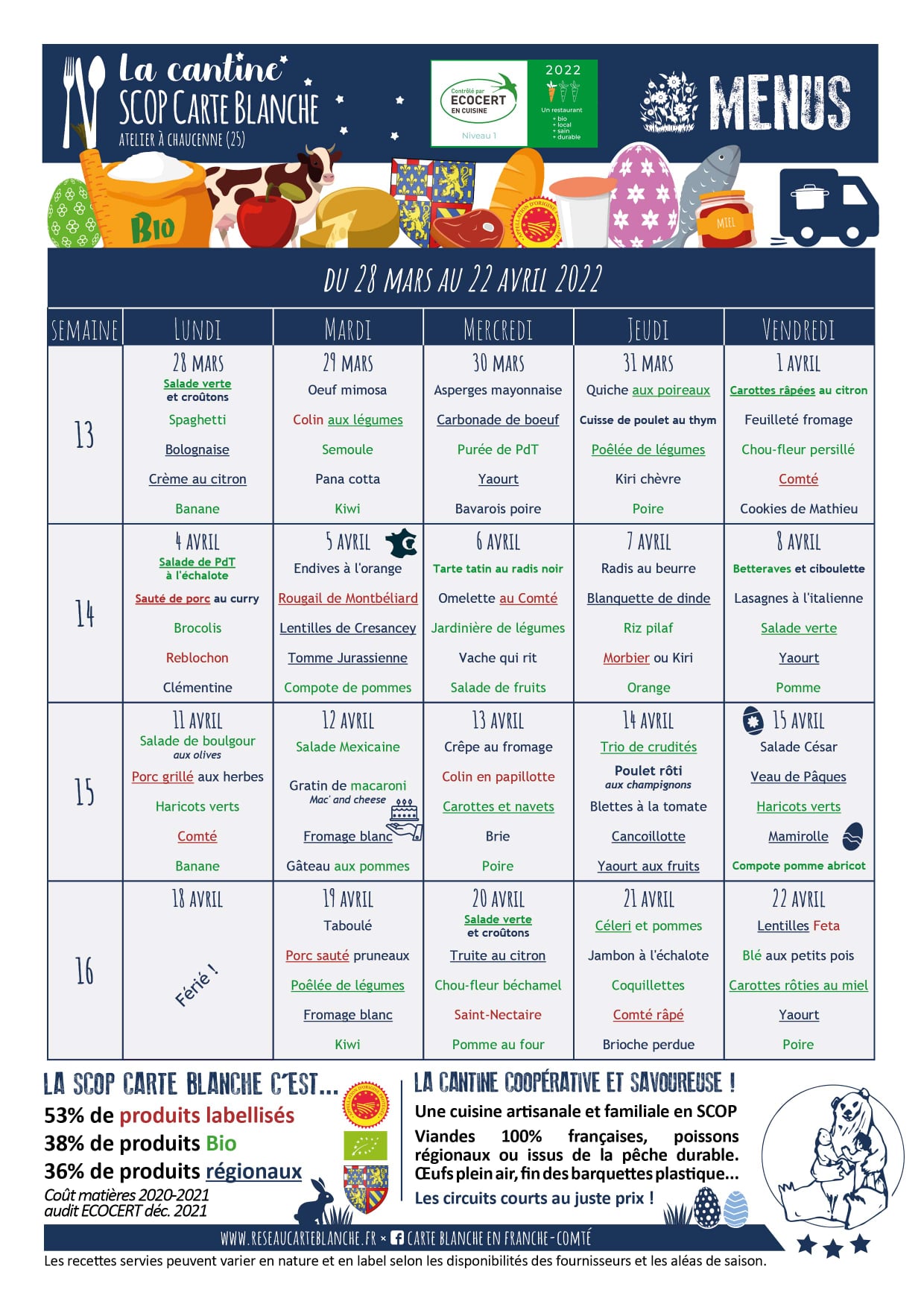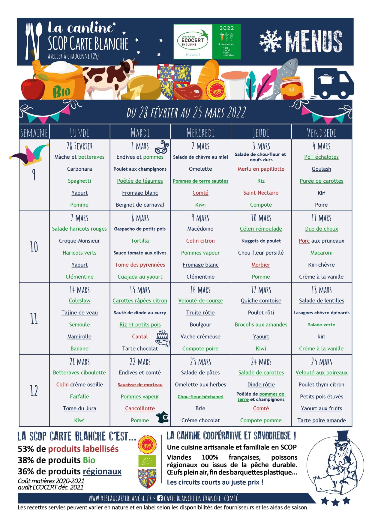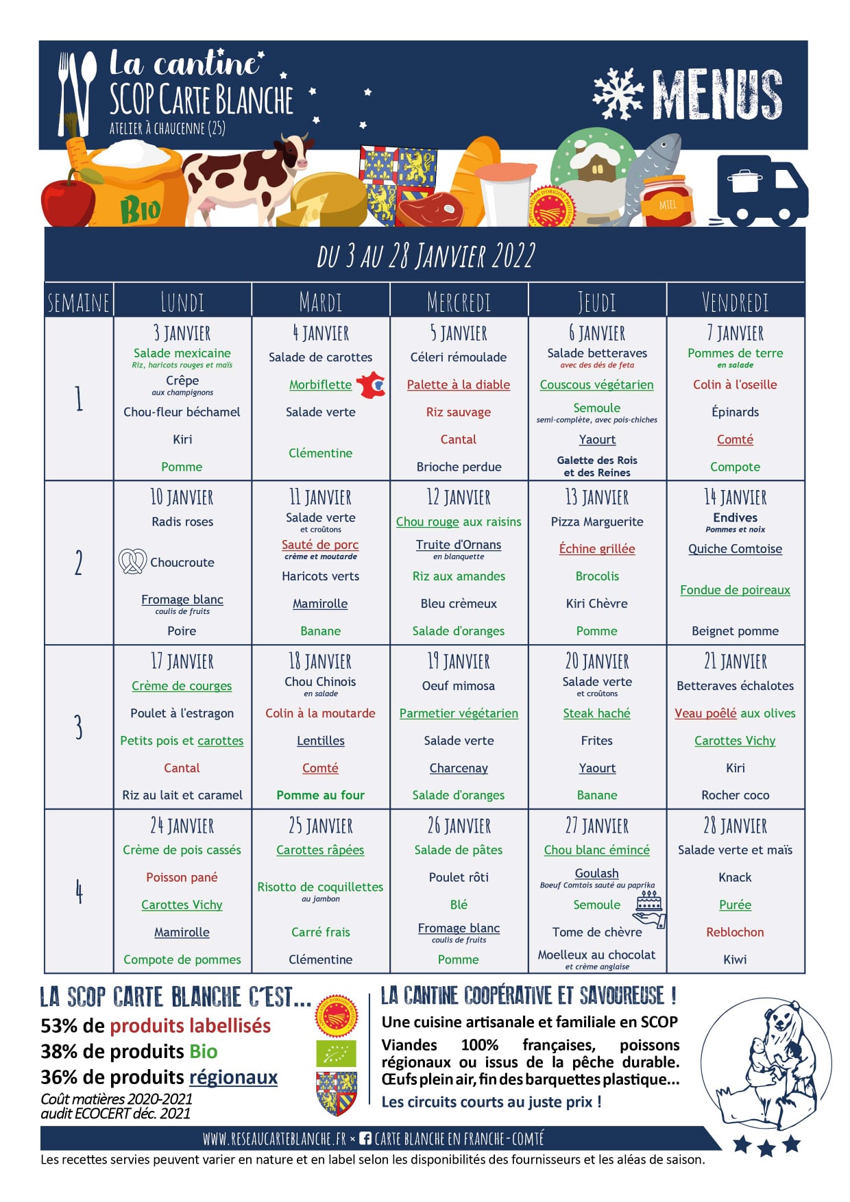 Menus Octobre 2022 Menu Juillet 2022:]][[Menu Juin 2022 : Menu Mai 2022 : Menu Avril 2022 Menu Mars 2022 Menu Février 2022 Menu Janvier 2022 En savoir plus Menu SCOP Carte Blanche - Octobre 2022.pdf552.43 Ko
