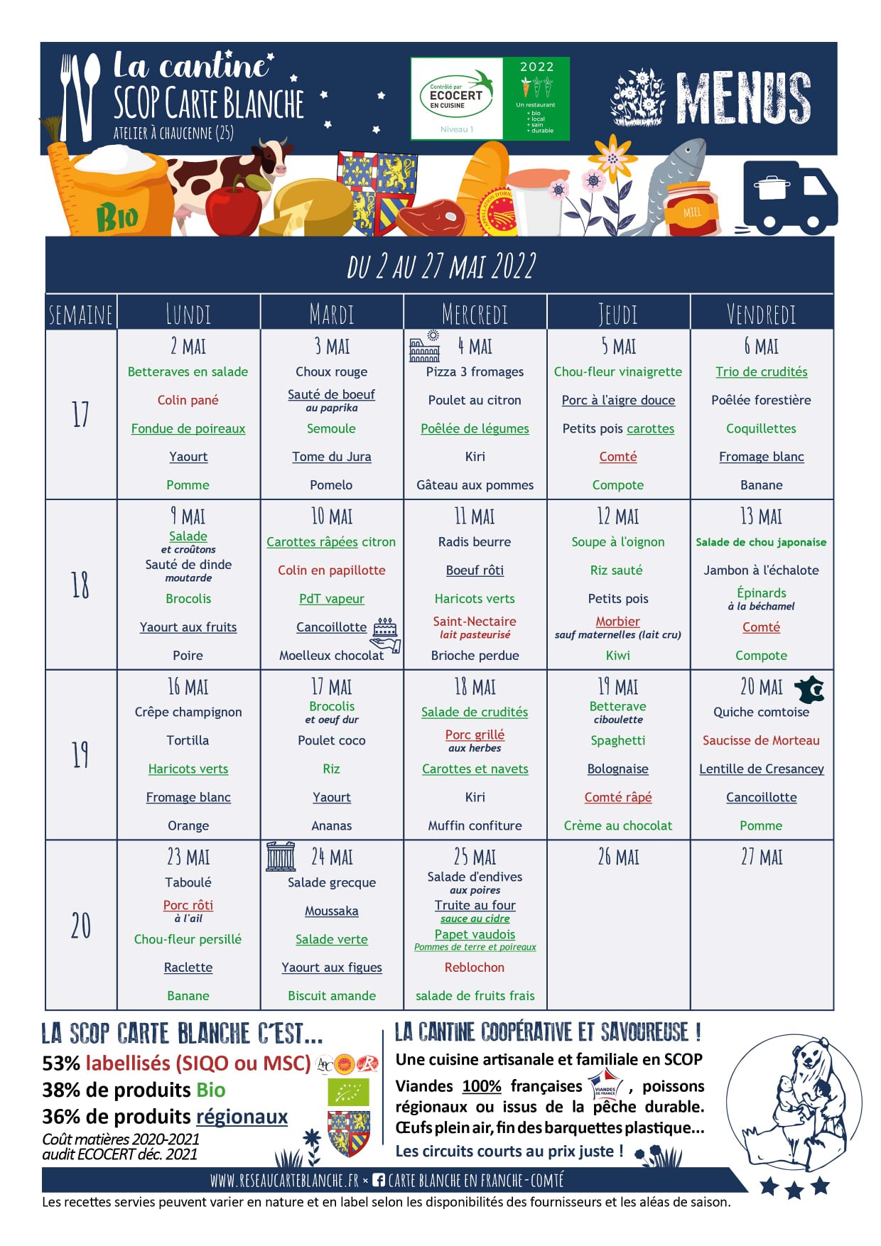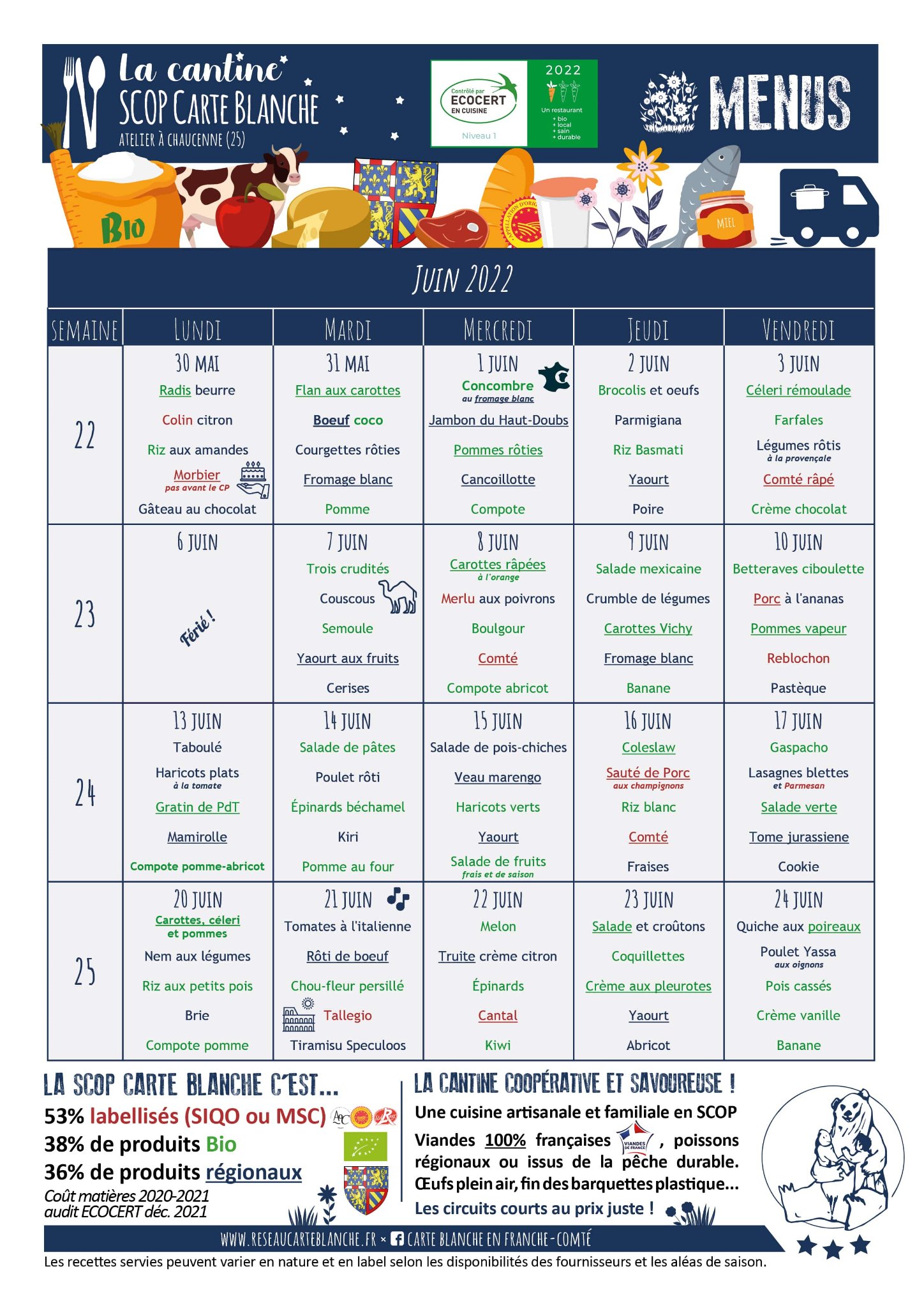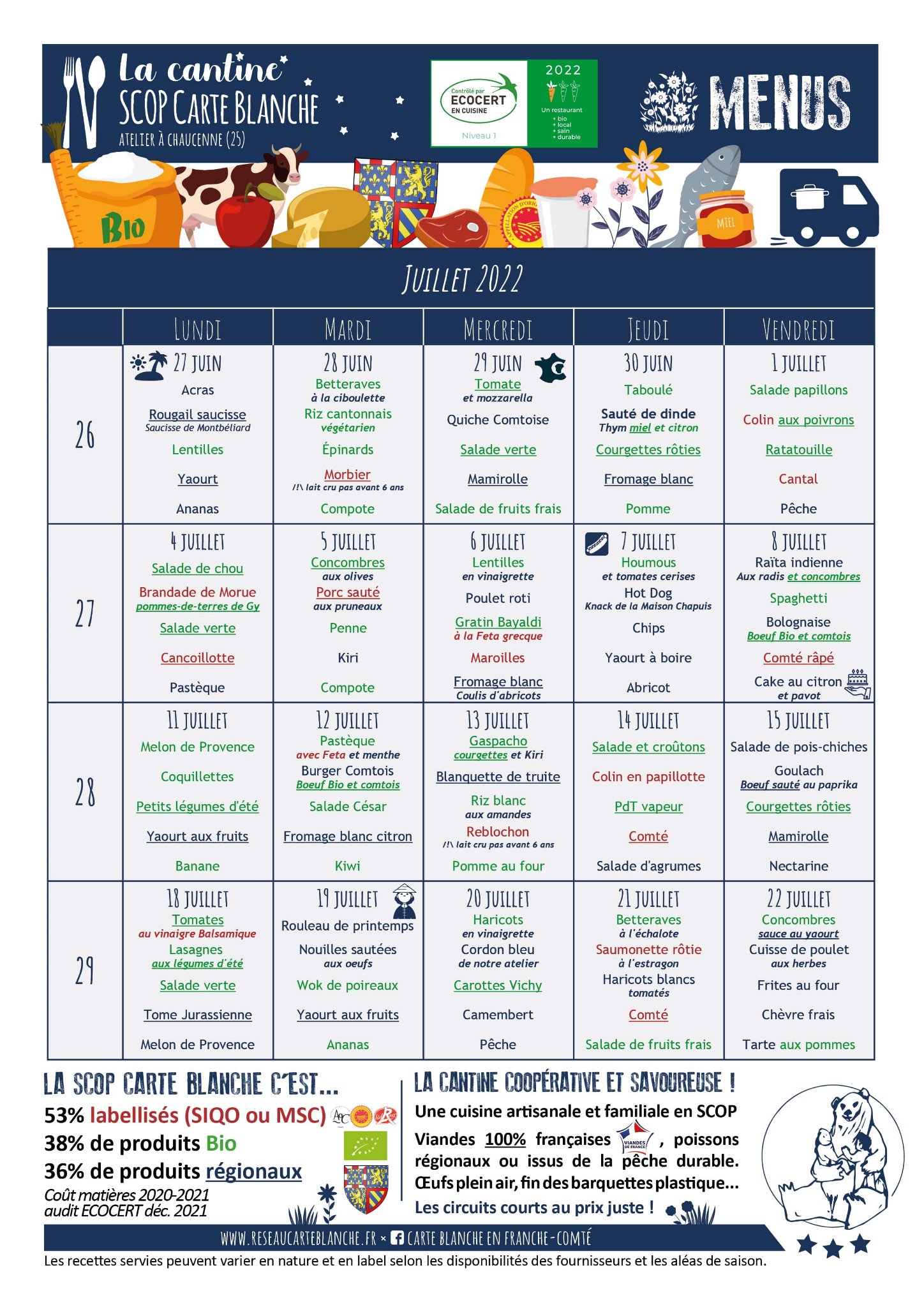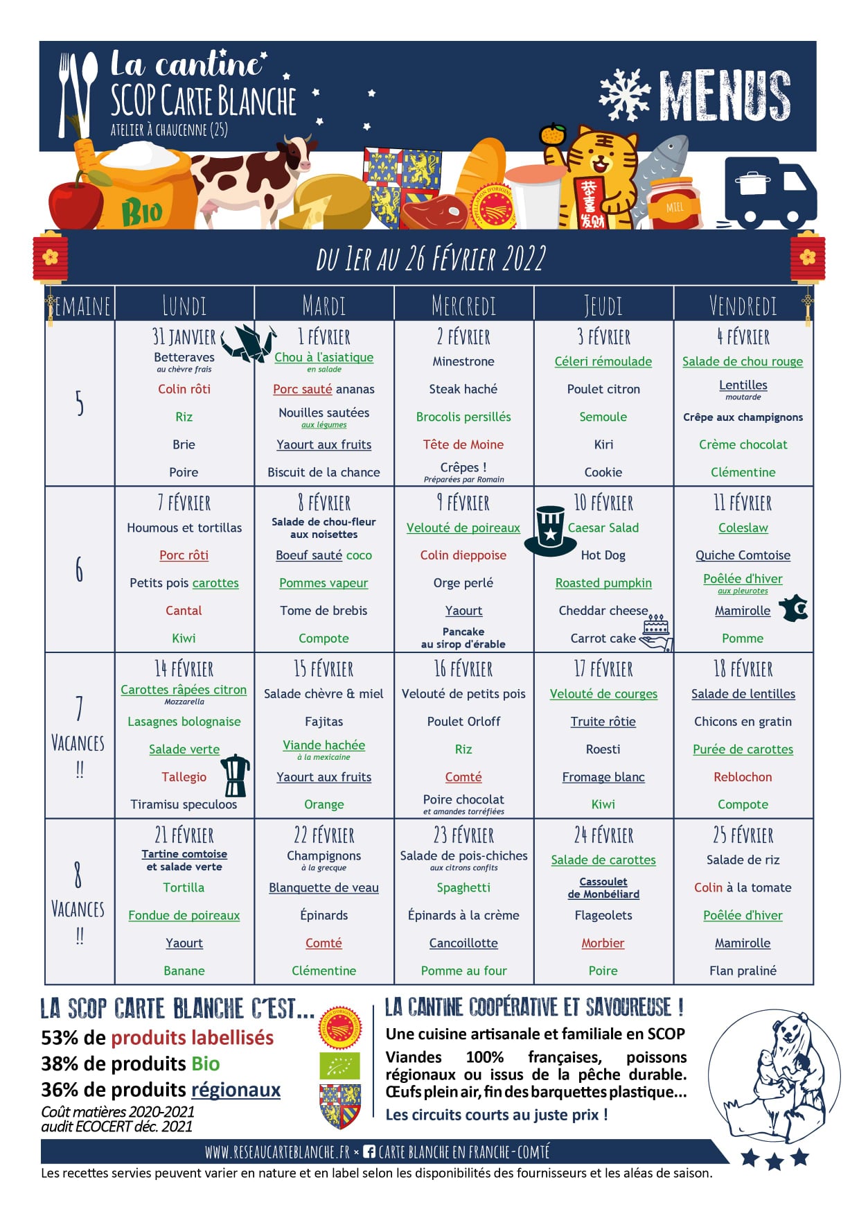 Menus Octobre 2022 Menu Juillet 2022:]][[Menu Juin 2022 : Menu Mai 2022 : Menu Avril 2022 Menu Mars 2022 Menu Février 2022 Menu Janvier 2022 En savoir plus Menu SCOP Carte Blanche - Octobre 2022.pdf552.43 Ko