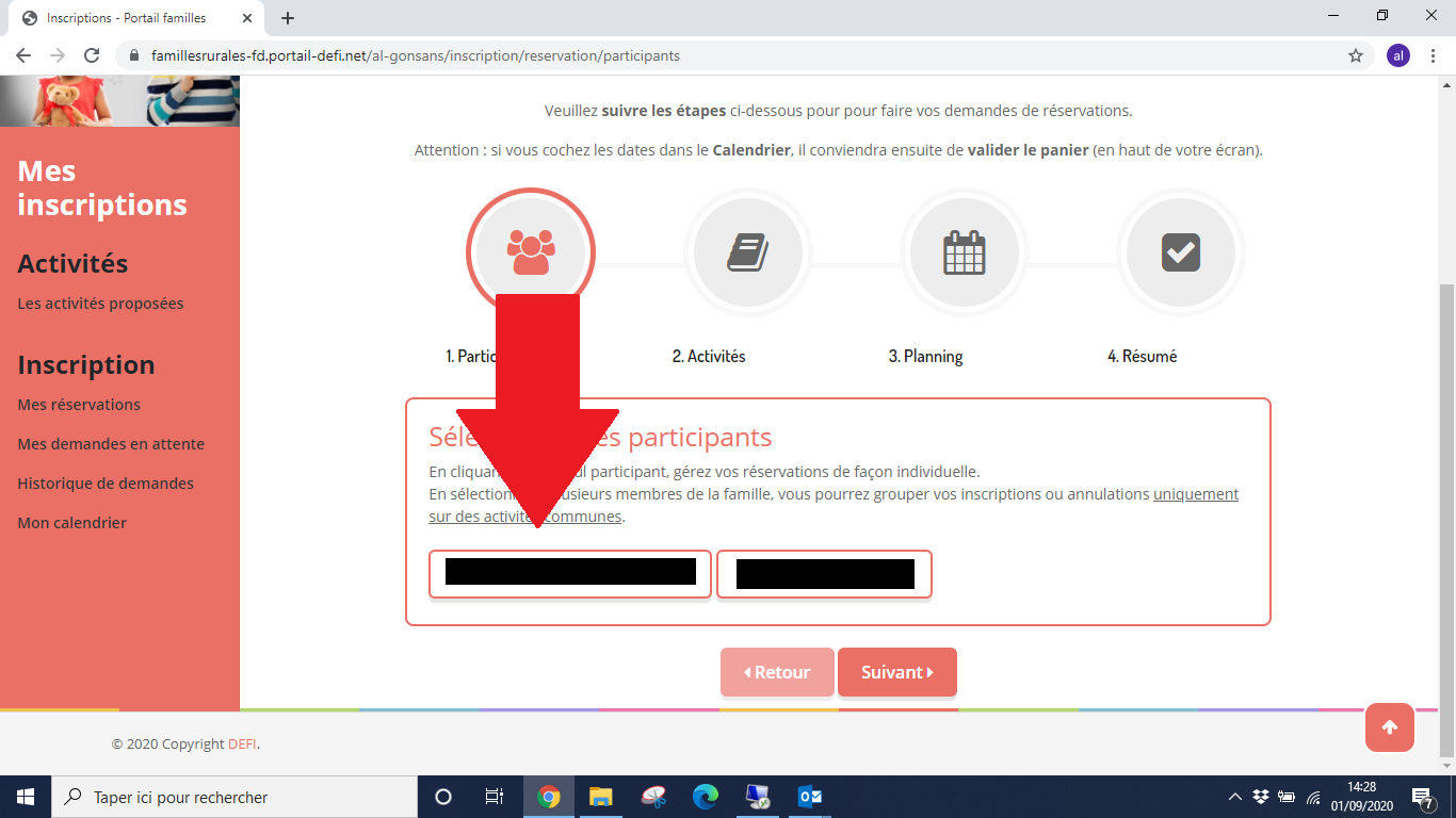 3) Il faut ensuite sélectionner le nom de l'enfant que vous souhaitez inscrire puis cliquer sur suivant :