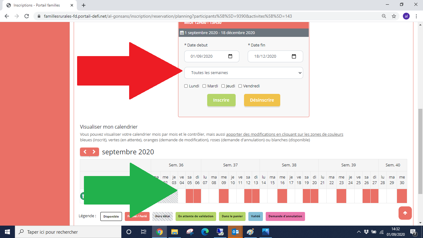 6) Vous pouvez ensuite soit inscrire votre enfant pour l'activité a de multiples dates via le planning (flèche rouge), soit directement faire des inscriptions ponctuelles sur le calendrier en bas (flèche verte), juste en cliquant sur la case vide du jour voulu.