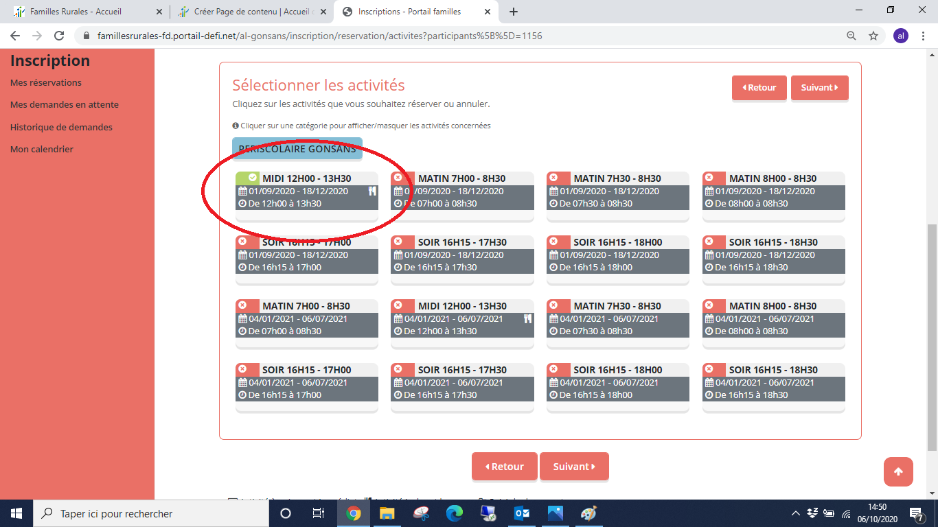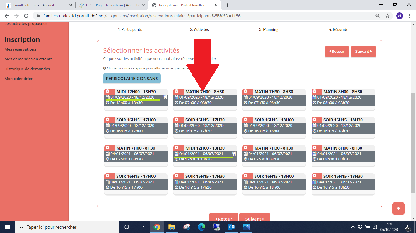 4) Il faut ensuite cliquer sur l'activité (les temps d'accueil) sur lesquels vous voulez inscrire votre enfant. Attention à prendre en compte les périodes des activités, elles correspondent aux deux moitiés de l'année (trait vert).