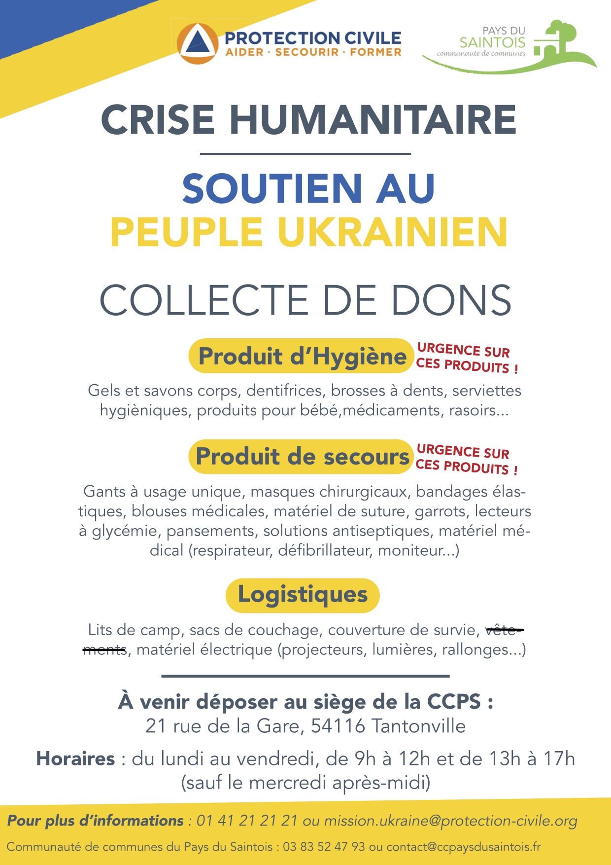 Les vêtements et denrées alimentaires étant en surstock, les besoins urgents se manifestent par la collecte de produits d’hygiène, de première nécessité pour les enfants et de premiers secours.
