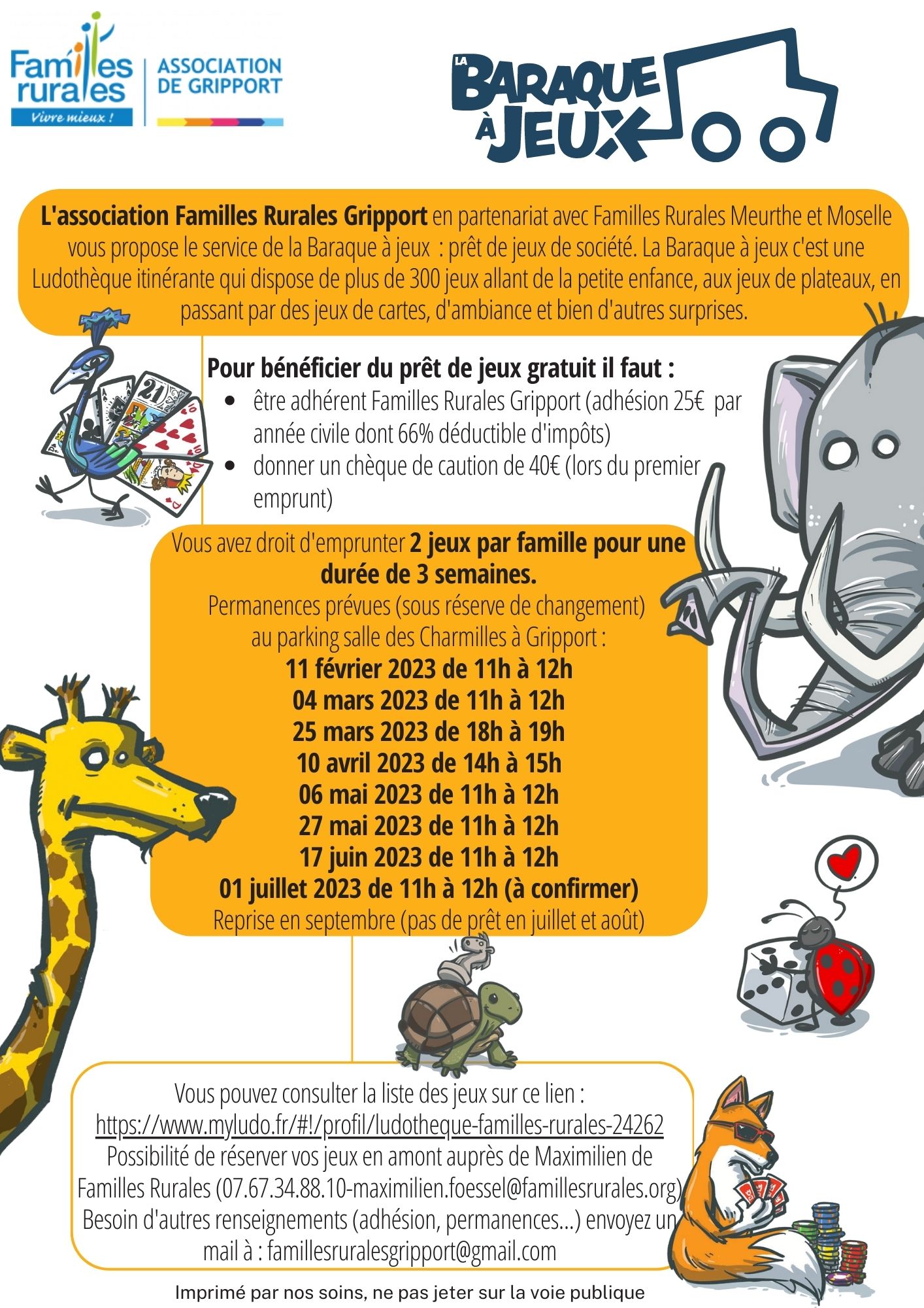 • Gratuit (être adhérent à l'association Famille Rurales Gripport - 25€ annuel - adhésion possible lors du premier retrait de jeux ou plus d'info sur notre page "Adhérer à l'association - tarifs et modalités")