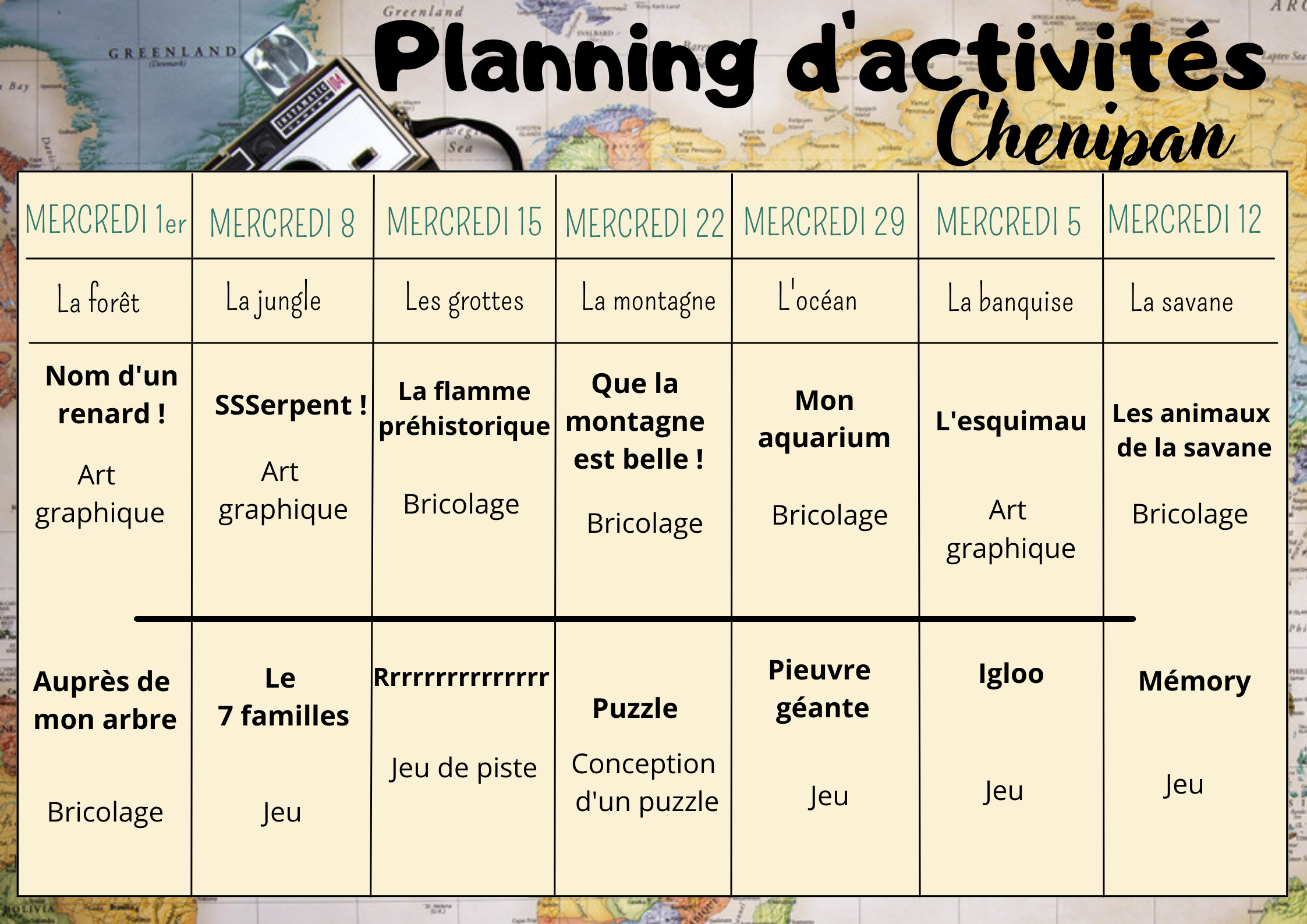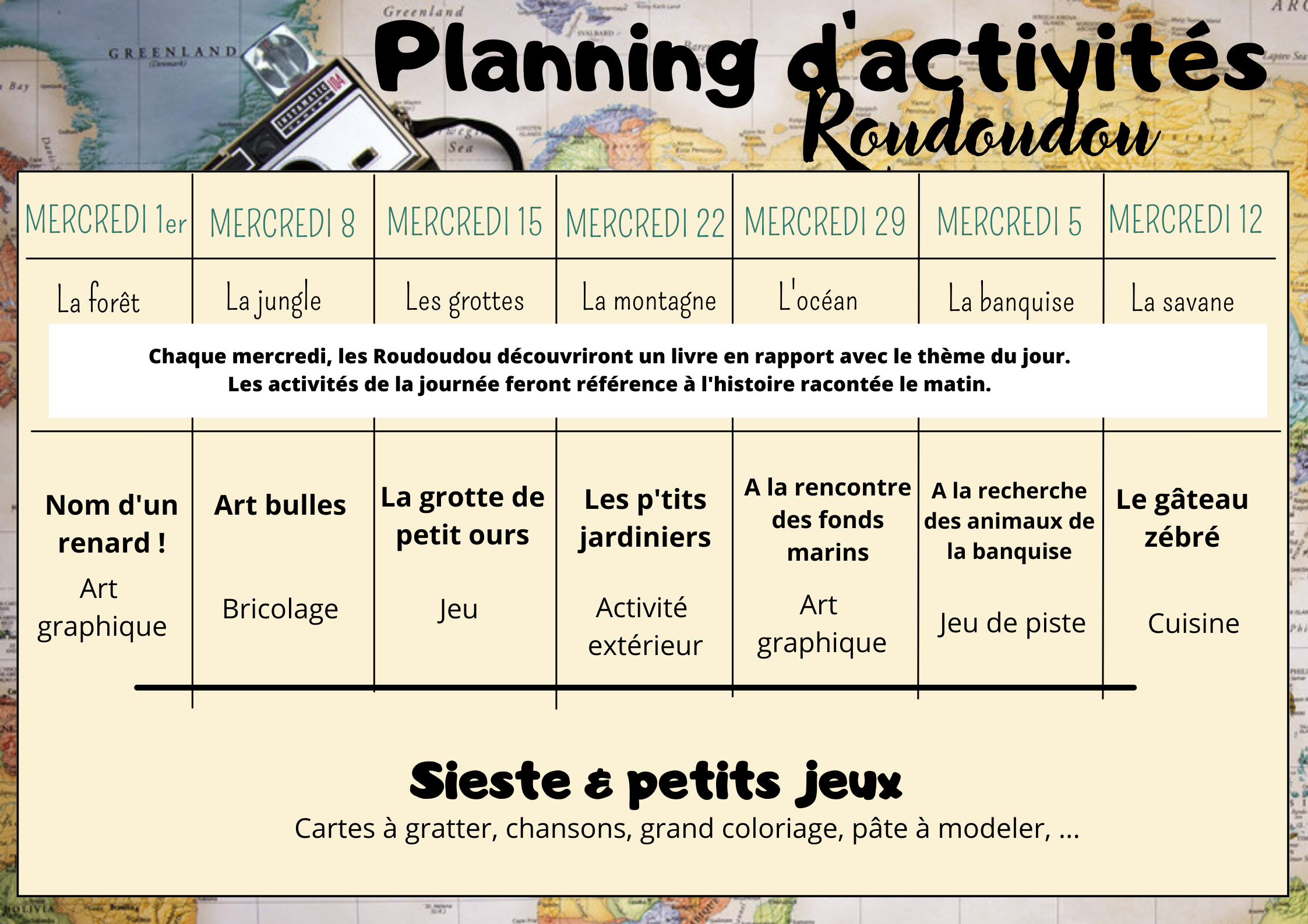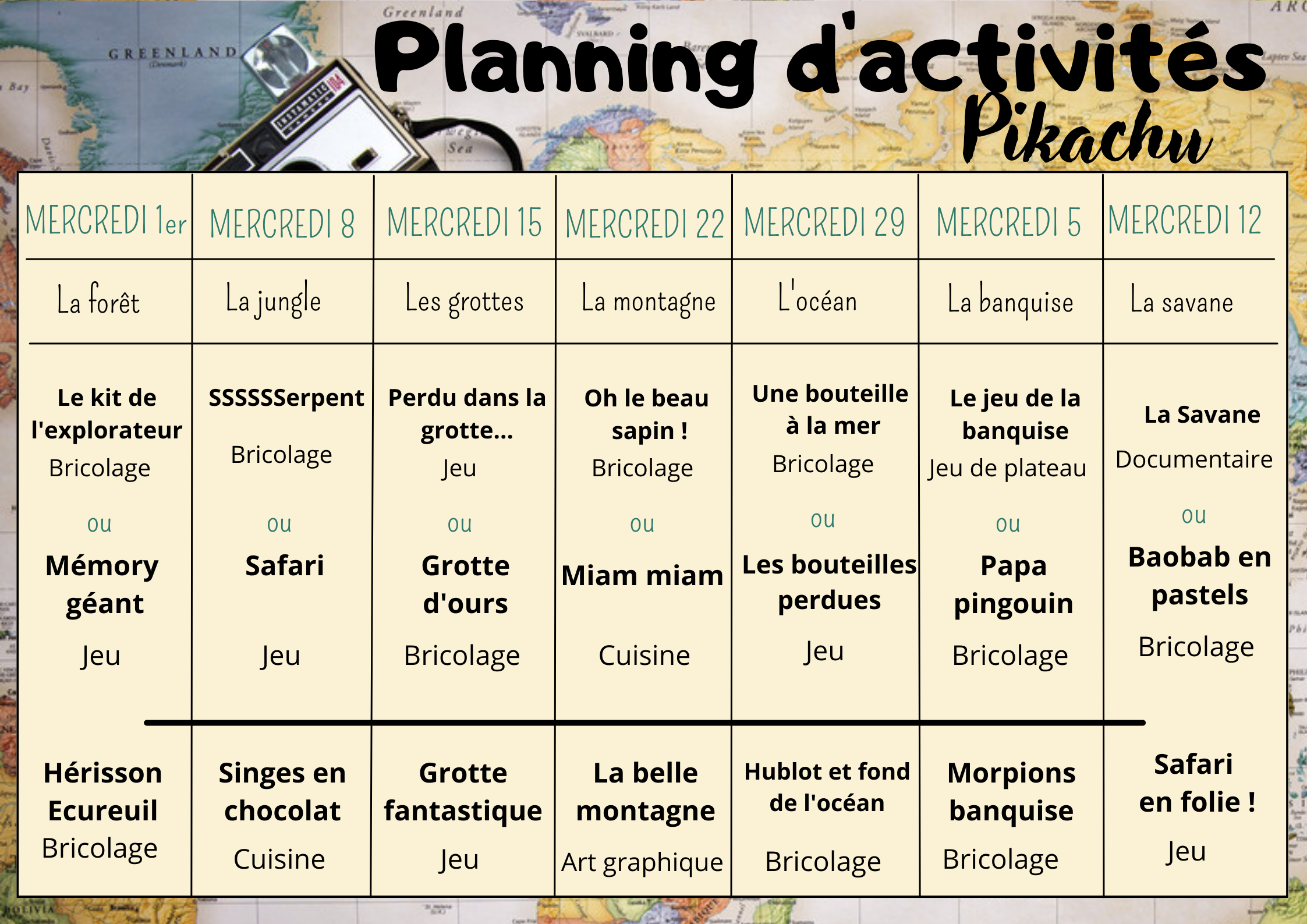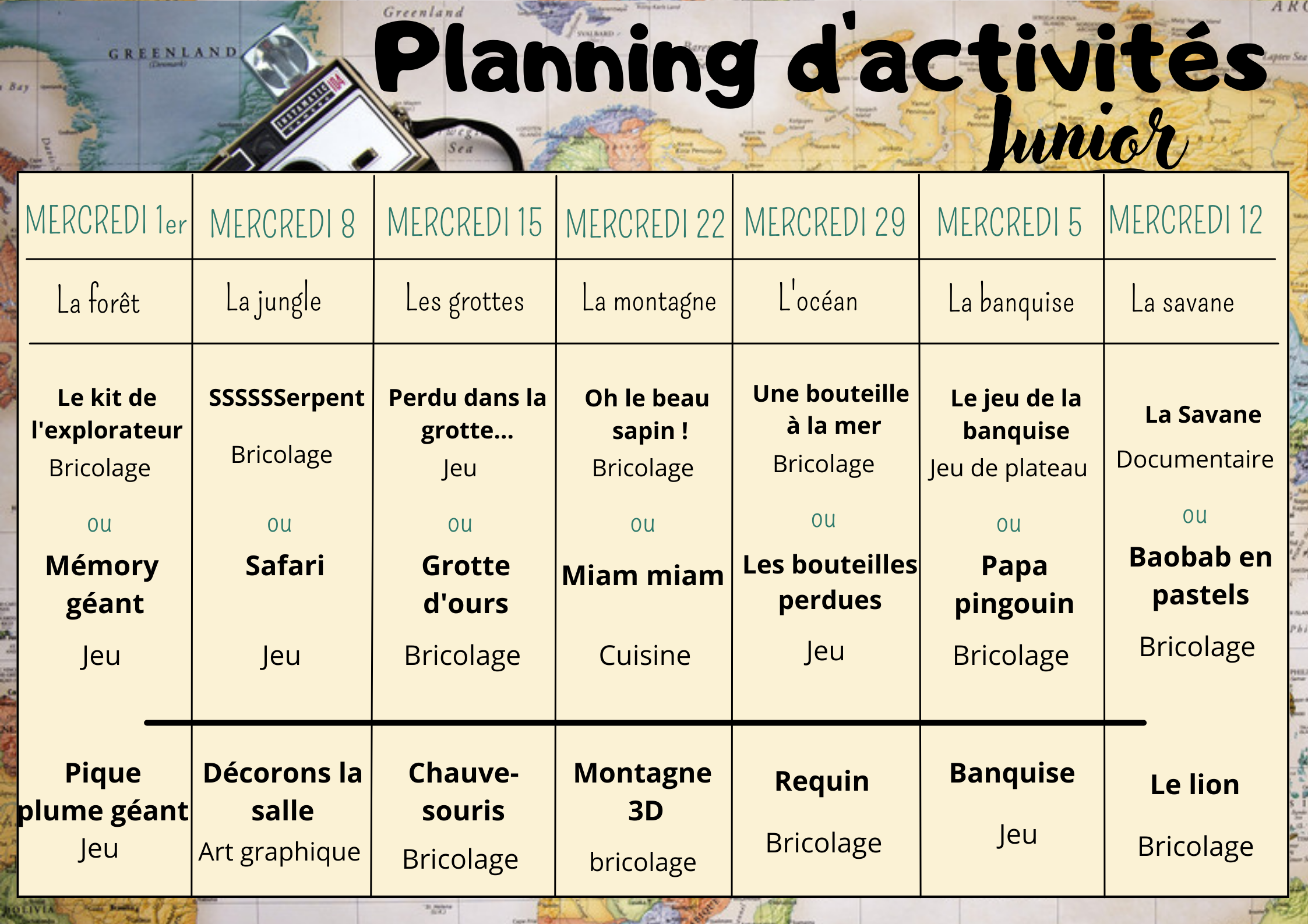 A chaque cycle de mercredis (de vacances à vacances), une nouvelle thématique est proposée aux enfants : voyage autour du monde, le cinéma, découverte de son territoire, cirque,etc. Les enfants approfondissent leurs connaissances, leurs savoirs faire, leurs savoirs être, d'une façon ludique à travers des jeux, du bricolage, du dessin, des jeux sportifs..... Et avec les copains !