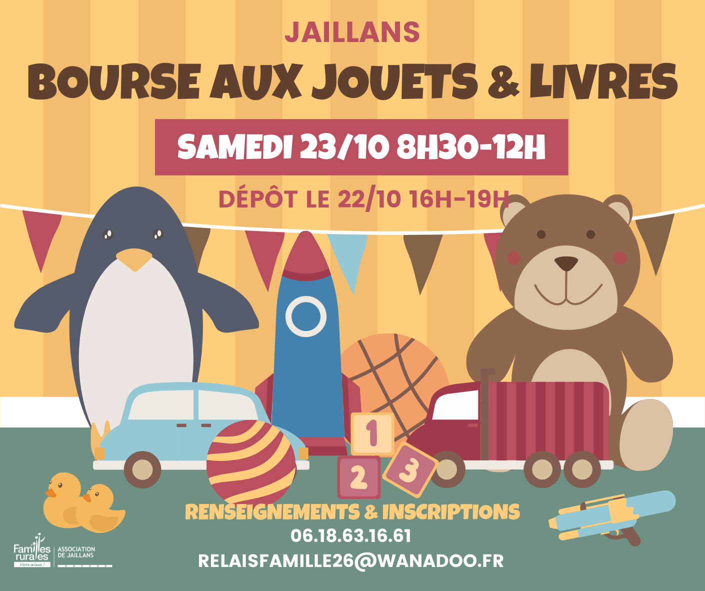 Bourse aux jouets & livres : Samedi 23/10 8h30 à 12h - salle des fêtes Henri Maret Jaillans Retrait des listes pour les déposants avant le 21/10/2021. 18 octobre 2021