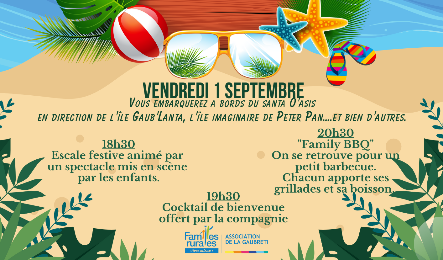 Le vendredi 1er septembre, le capitaine du Santa O'asis et son équipage vous invitent à venir faire une dernière croisière en famille avant son retour définitif au port. Vous pourrez ainsi découvrir les îles visitées par vos enfants tout au long de ces vacances d'été. Nous ferons enfin une dernière escale sur l'île O'asis pour fêter la fin de ces vacances. Vous assisterez à un spectacle préparé par les enfants, un cocktail vous sera ensuite offert par la compagnie suivi par un Family BBQ