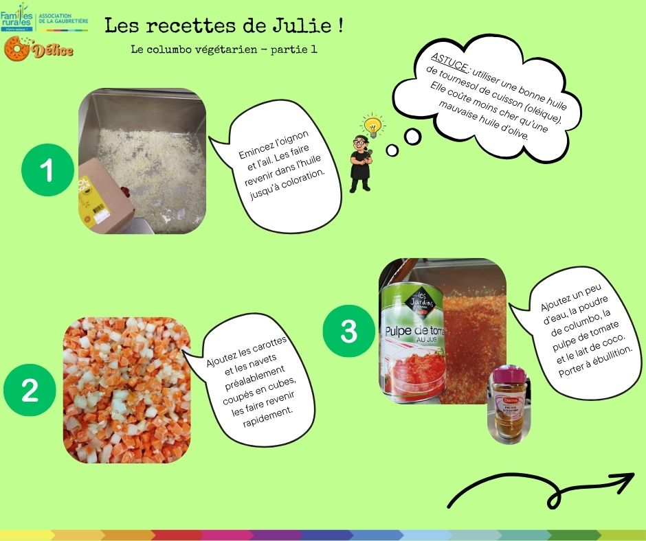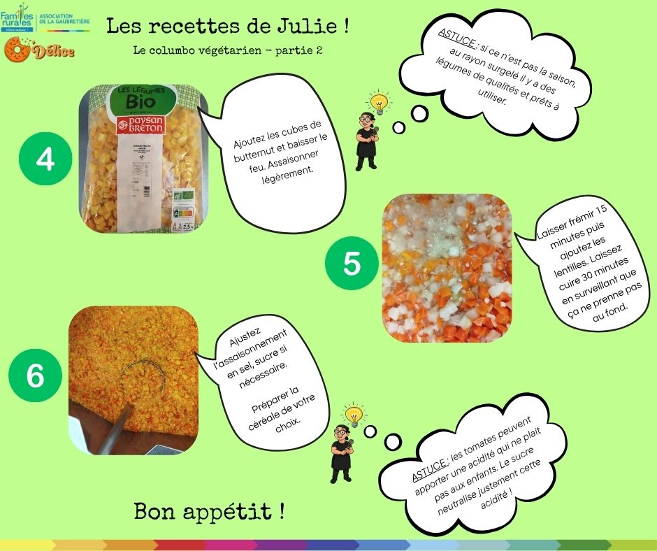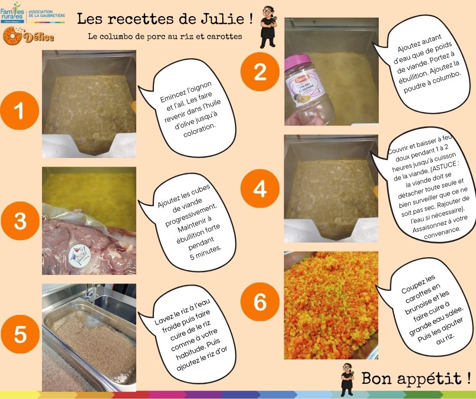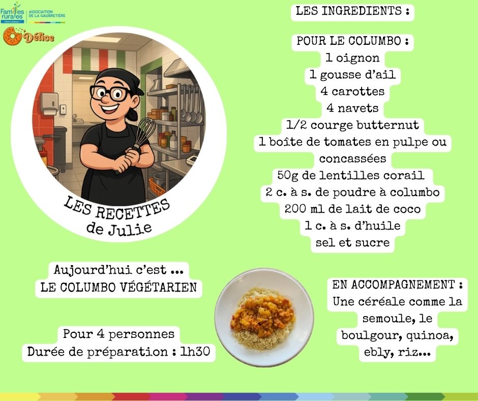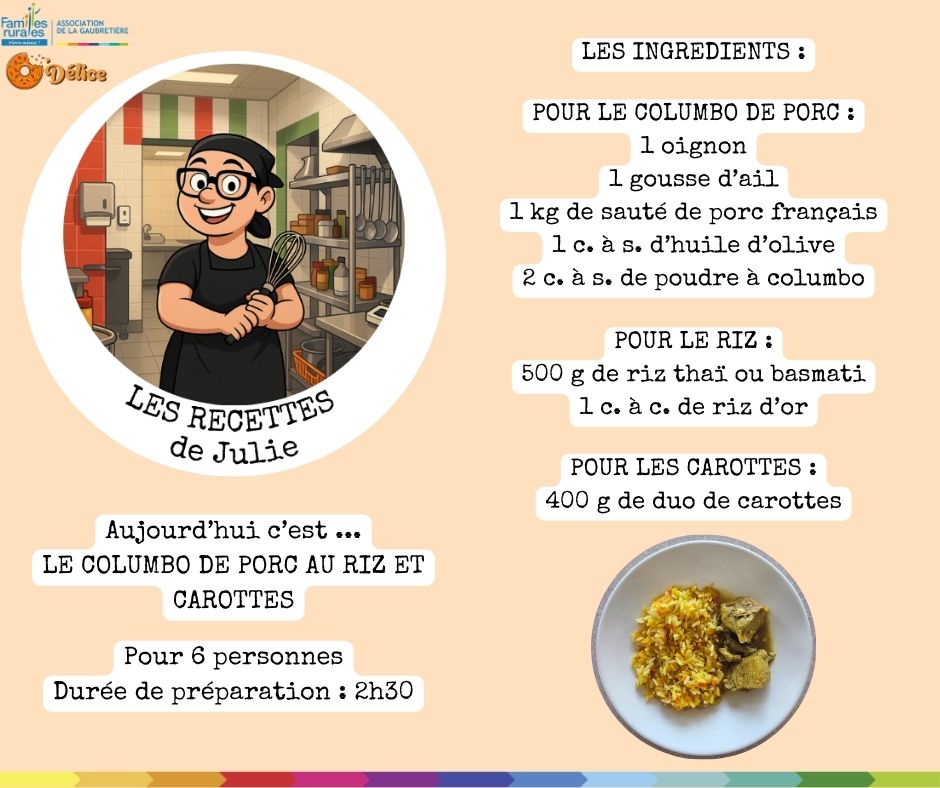 LES NEWS chez O'DELiceNouvelle rubrique pour vous les gourmandsJulie, notre cuisinière, nous partage ses recettes plébiscitées par les enfants Les recettes de JulieNous commençons par un colombo de porc Version végétarienne