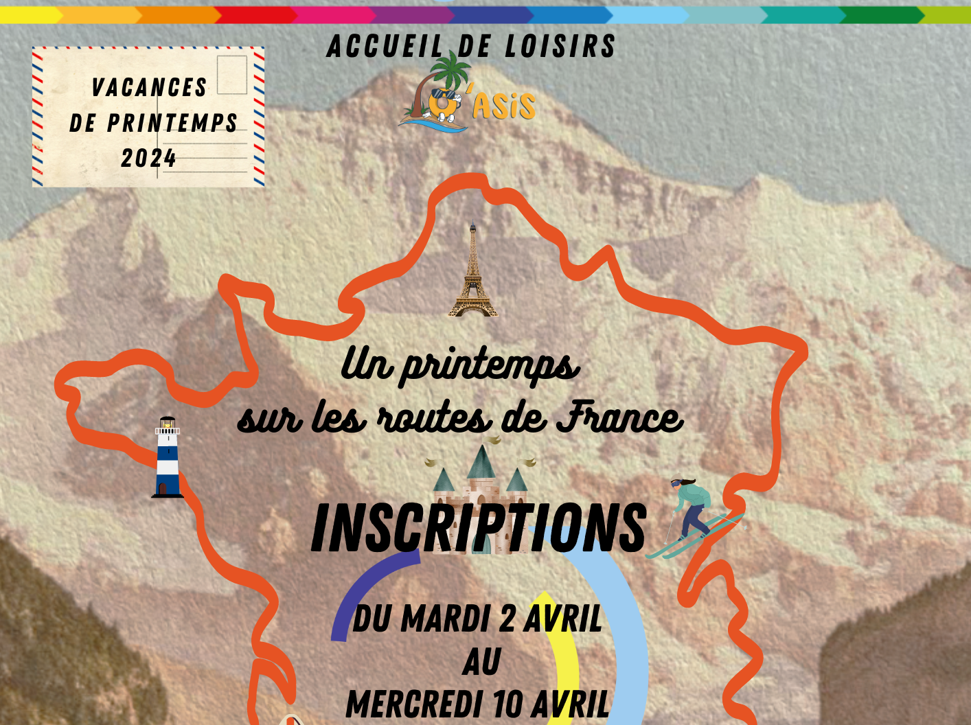 Hello tout le monde, il parait que les voyages forment la jeunesse. En tout cas, c'est ce que pense Roxy un jeune aventurier qui a décidé de passer ses vacances de printemps sur les routes de France. Le problème, c'est qu'il ne connait pas du tout la France et qu'il a besoin d'aide pour pouvoir découvrir les régions dans les meilleures conditions. Et comme nous les animateurs n'y connaissons pas grand chose, nous aussi allons avoir besoin de toi pour l'accompagner pendant ses découvertes. Si tu es OK, nous te proposons de venir nous rejoindre du 22 avril au 3 mai. Quand à vous parents, réservez le vendredi 26 avril pour un beau temps fort familles. Les inscriptions démarrent le mardi 2 avril à 19h00 et se finissent le mercredi 10 avril à 19h00. Le programme? c'est juste en bas ou sur le site.