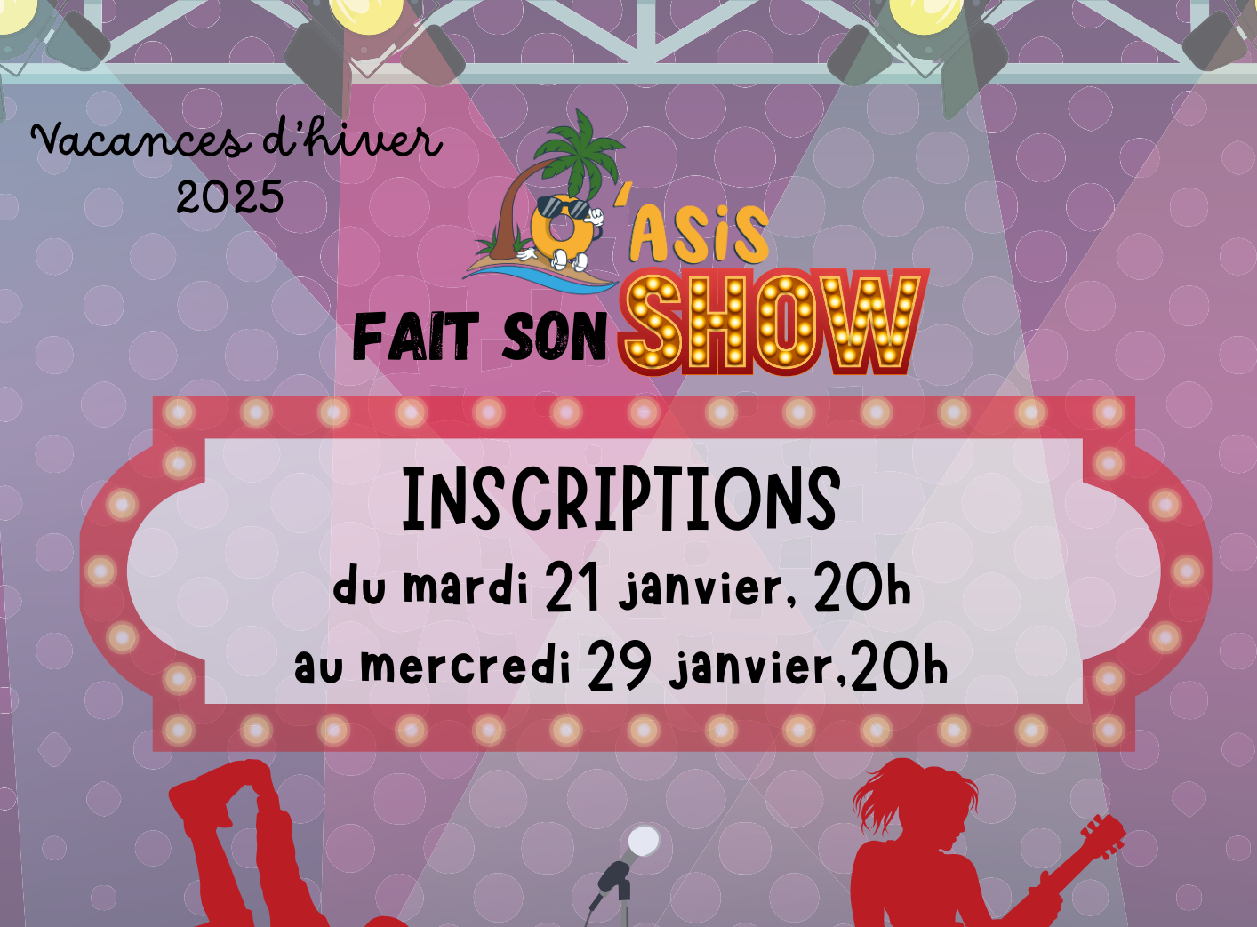 POUR LES INSCRIPTIONS, C'EST A PARTIR DU MARDI 21 JANVIER A 20H00 AU MERCREDI 29 JANVIER A 20H00 SUR LE PORTAIL FAMILLES. On vous attend nombreux.