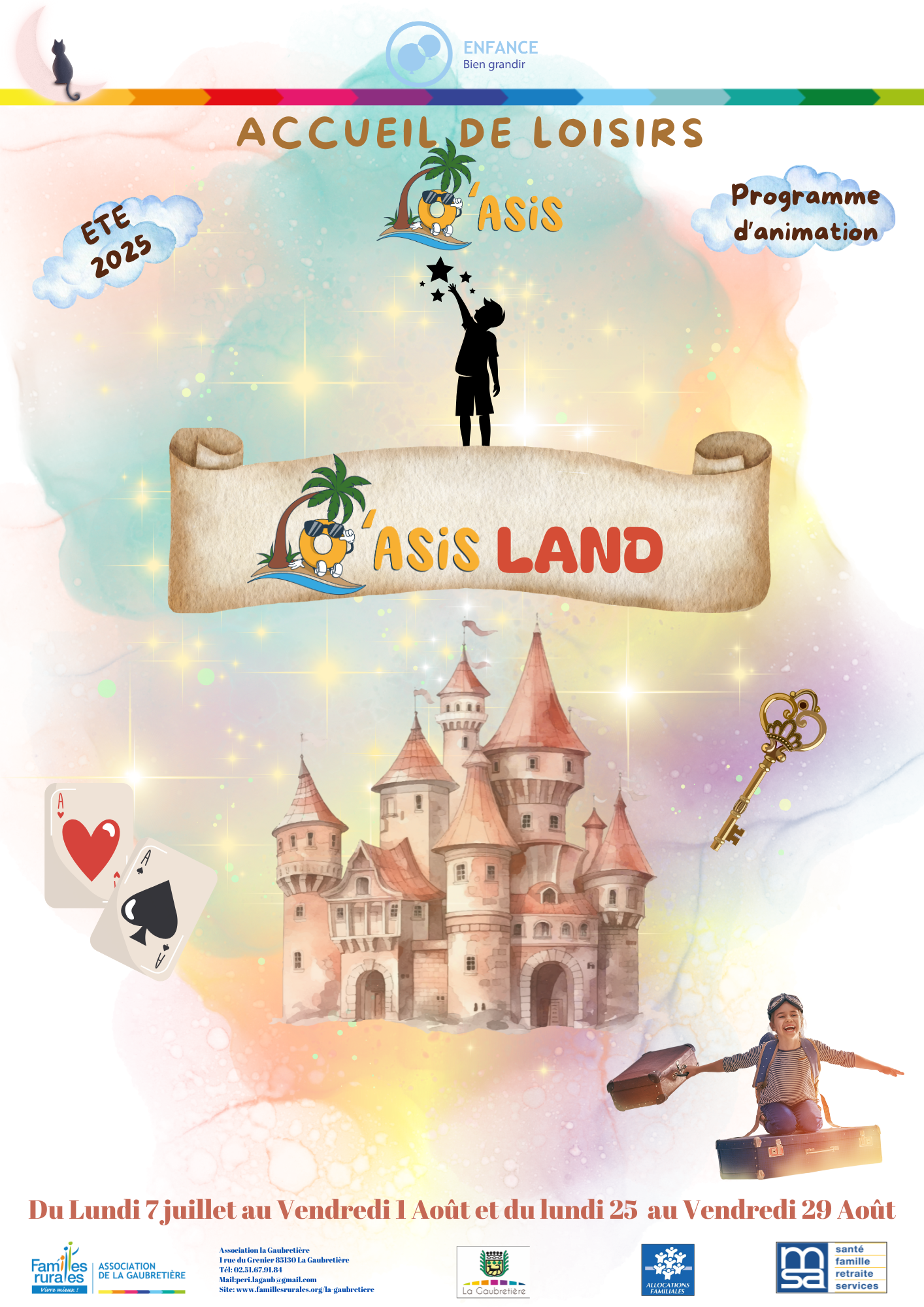 Bienvenue à O'asis Land ! Notre belle contrée est composée de 4 territoires très différents les uns des autres. Aventurland, Festiland, Fantaisiland et Naturland. Chez les uns on préfère se dépasser en faisant du sport, partir en exploration, relever des défis et résoudre des énigmes alors que chez d'autres, on adore faire la fête, danser, faire de la musique. Pour d'autres encore, on préfère laisser place à l'imaginaire, aux idées un peu folle, jouer, entrer dans la peau des différents personnages. Et chez les derniers, c'est plutôt être au contact de la nature, créer avec elle. Bref, pas toujours facile de les mettre d'accord. Et pourtant il va falloir y arriver car notre château n'a pas résisté à la grosse tempête de l'hiver et notre pancarte a disparu. Difficile d'accueillir les visiteurs dans ces conditions. Alors que tu te sentes plutôt aventurier intrépide, danseur émérite, rêveur ou amoureux de la nature, nous avons besoin de toi pour reconstruire le château et retrouver la pancarte. Défis, coopération, fun, jeux et plein de belles surprises t'attendent pour que tu puisses passer un été inoubliable. Sans oublier le spectacle, et la barbecue partie pour terminer ces chouettes vacances. Prêt pour l'aventure?