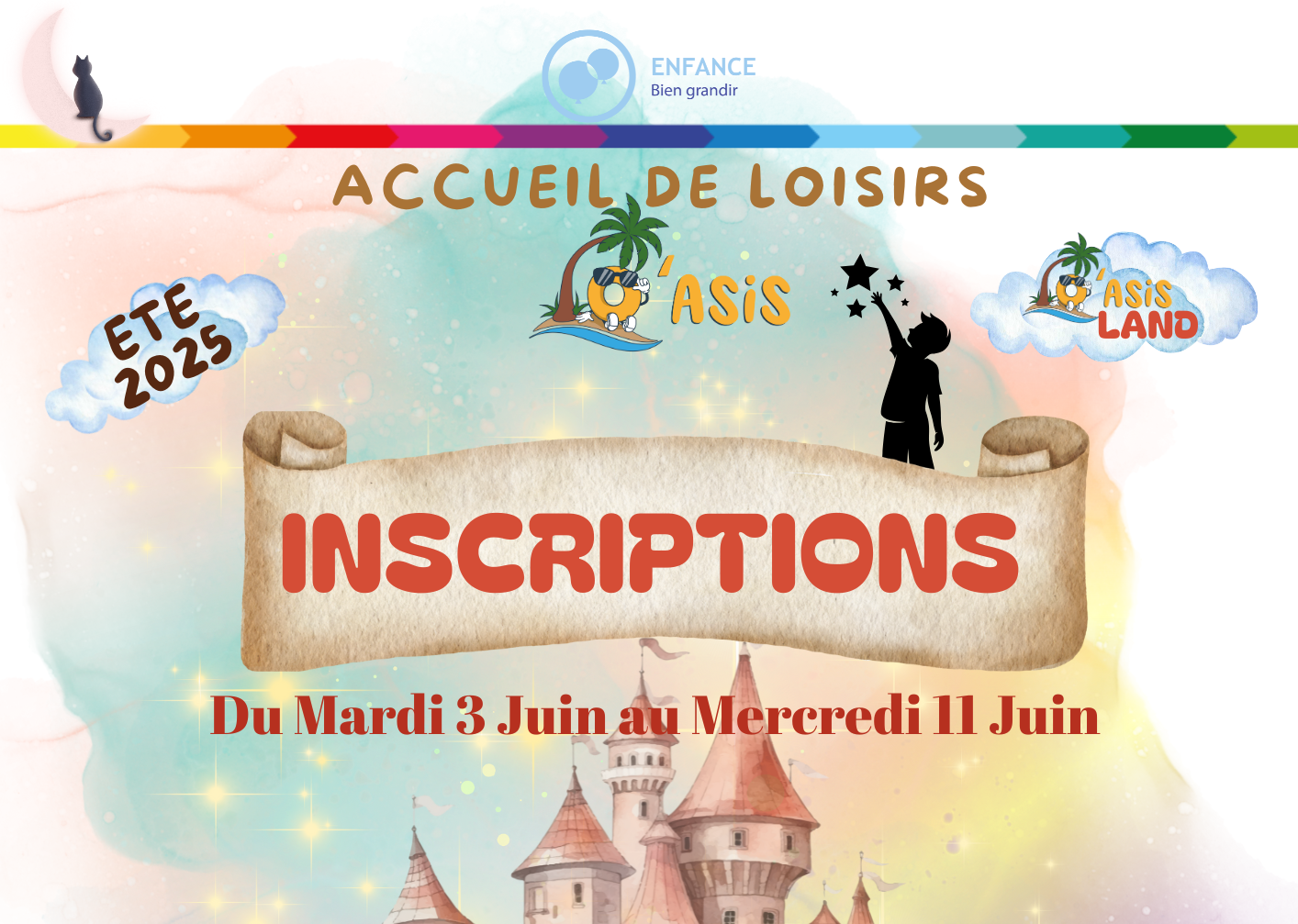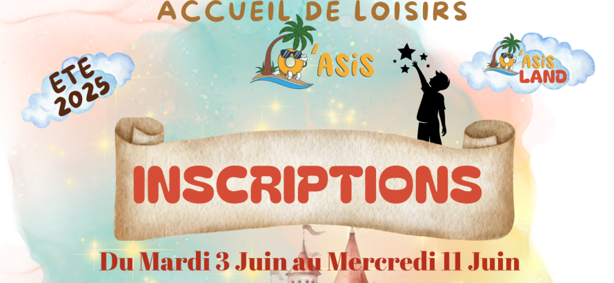 Les inscriptions commencent le mardi 3 juin et se terminent le mercredi 11 juin. Pour parents, je vous invite à aller sur l'onglet "Enfance 3-11ans" puis " accueil collectif de mineurs O'asis" pour trouver toutes les infos nécessaires puis de regarder les différents programmes en fonction des âges de vos enfants.