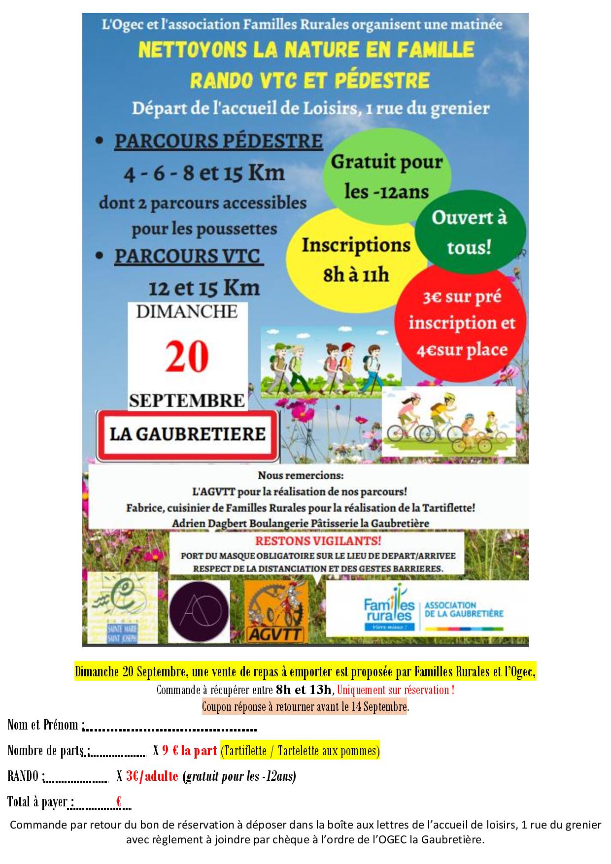 Tous à vos chaussures et vélos! le dimanche 20 septembre, Familles rurales et l'Ogec de l'école Sainte Marie organisent une matinée rando pédestre et VTC avec pour thème "Nettoyons la nature". Toutes les infos sur l'affiche jointe.