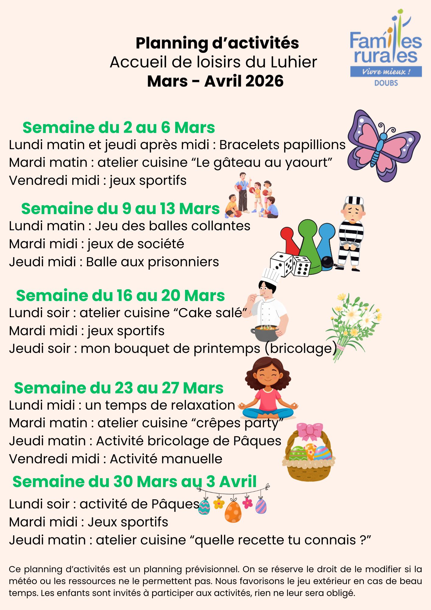 Le printemps arrive doucement, vous trouverez ci dessous le planning des activités que nous proposons aux enfants durant la période de Mars-Avril 2026.