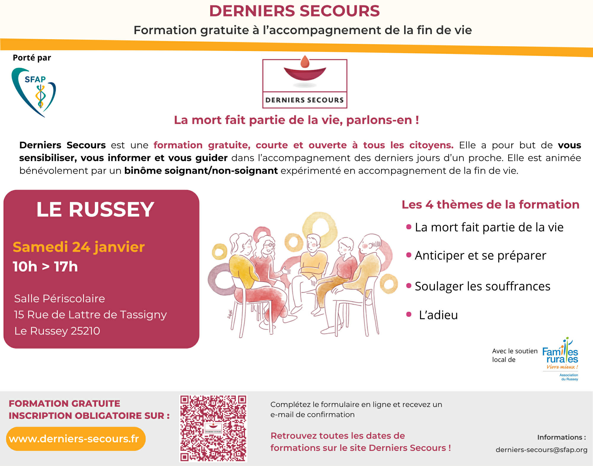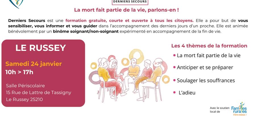 Derniers secours est une formation gratuite , courte et ouverte à tous les cytoyens. Elle a pour but de vous sensibiliser, vous informer et vous guider dans l'accompagnement des derniers jours d'un proche. Elle est animée bénévolement par un binôme soignant/ non-soignant expérimente en accompagnement de la fin de vie