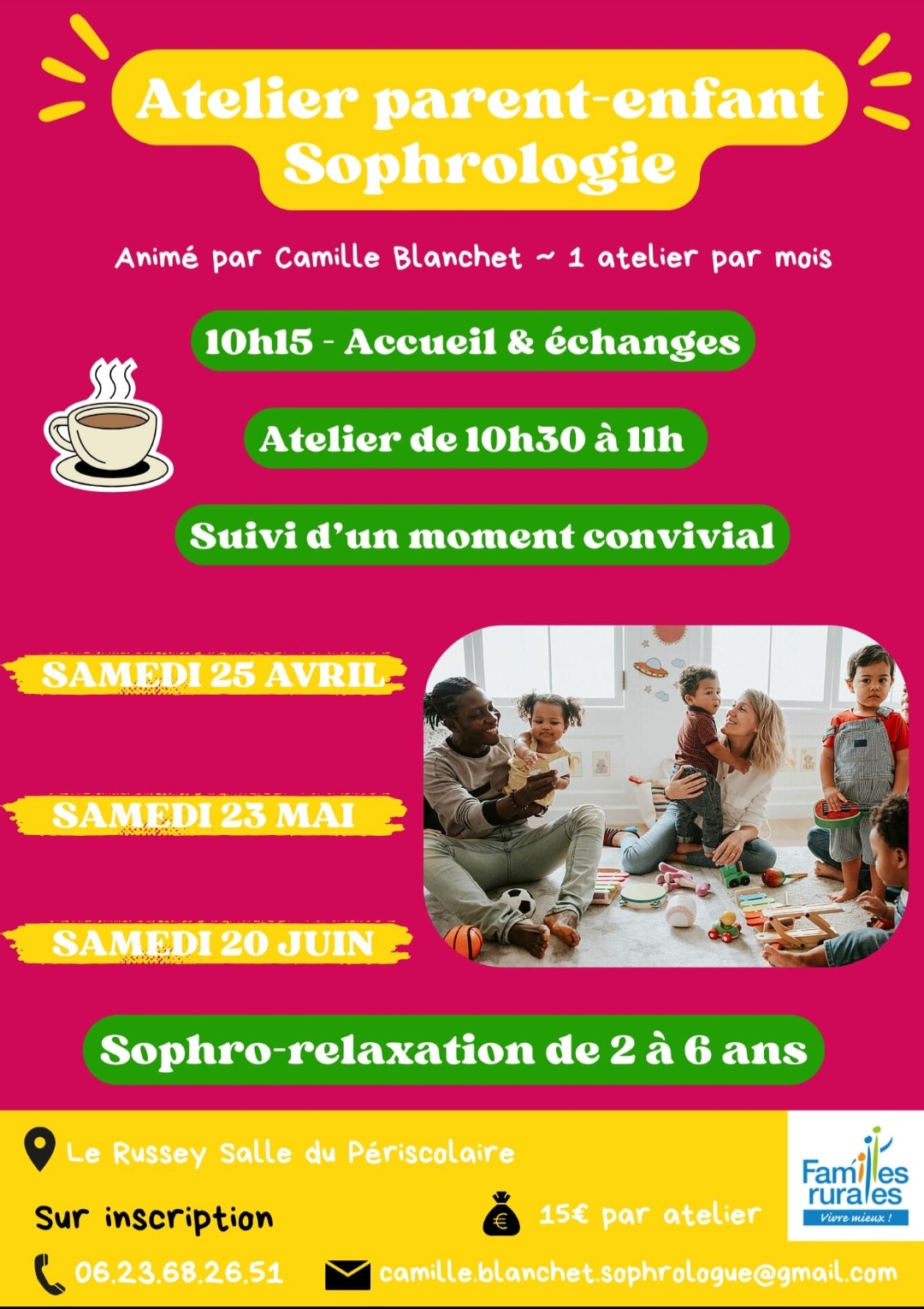 - 1 atelier par mois pour partager un moment de détente en famille