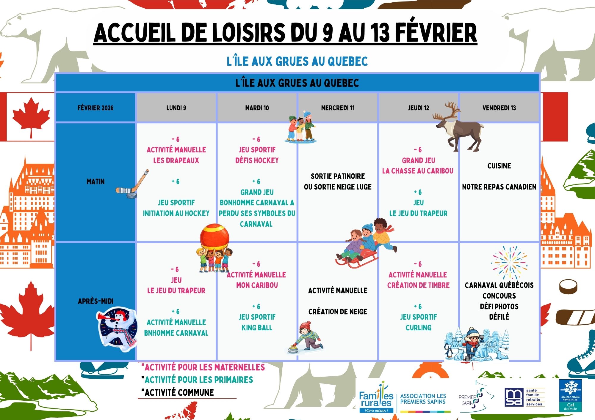 Le mercredi une sortie patinoire et/ou luge suivant le temps sera organisé le matin.