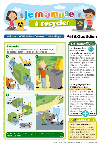 Au Périscolaire nous apprenons aux enfants à faire du tri sélectif, c’est-à-dire à trier les déchets par catégorie (nourriture, papier, verre…), même vers 3 ou 4 ans ils comprennent très bien. Nous leur expliquons ainsi que certains déchets comme le verre et le plastique ne peuvent pas être détruits par la nature et qu’il est donc essentiel de les trier pour pouvoir ensuite les recycler. En pratique, nous avons une poubelle pour les déchets ordinaires, un bac pour le verre et un sac pour les déchets en plastique et autre qui vont au tri. Dans un premier temps, nous montrons aux enfants comment ils doivent trier les déchets puis nous les laissons ensuite faire tout seul. Nous pensons à bien les féliciter pour valoriser leurs gestes et les encourager dans ce sens.