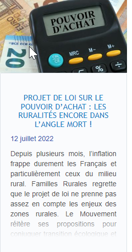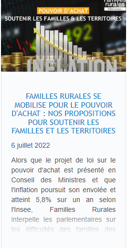 Enfin, s’agissant de la prise en compte du budget alimentation des ménages, pour l’heure grand absent des débats, Familles Rurales attend du Sénat des mesures ambitieuses pour éviter que des millions de nos concitoyens renoncent à une alimentation saine, faute de moyens. Le «chèque alimentaire » de 100 € plus 50 € par enfant à charge, annoncé par le Gouvernement, non ciblé sur l’alimentation et versé en une fois, ne répond pas à l’enjeu économique et de santé publique d’une alimentation plus saine. Seule une aide ciblée sur des produits alimentaires sains et versée mensuellement sous conditions de ressources est à même de garantir un changement des habitudes alimentaires. Rappelons que les conséquences de la « malbouffe » induisent des dépenses de santé considérables de plus de 20 milliards d’euros par an. L’alimentation reste un enjeu majeur tant économique et de santé publique.
