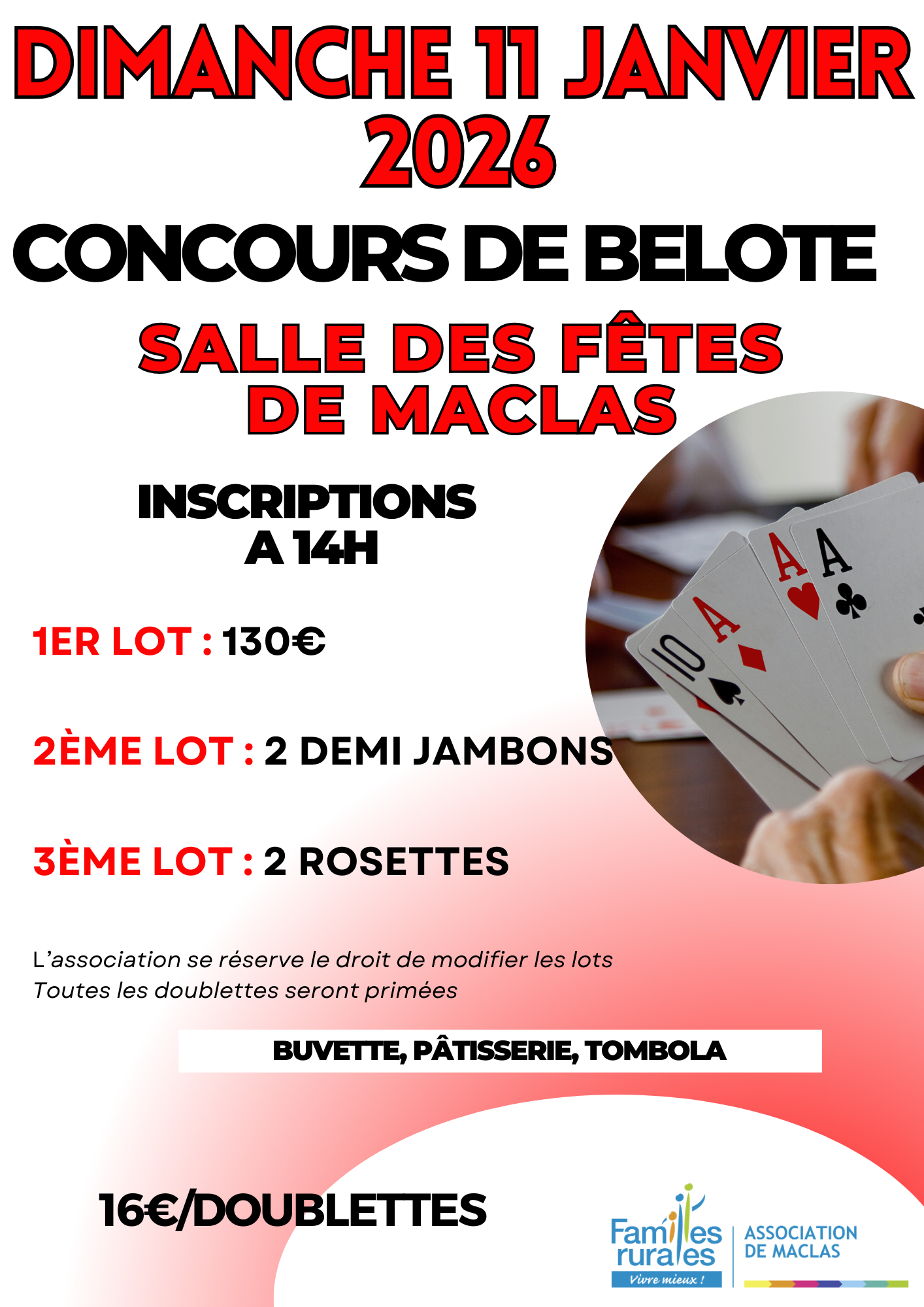 Notre association Familles Rurales Maclas organise un concours de belote le dimanche 11 janvier prochain