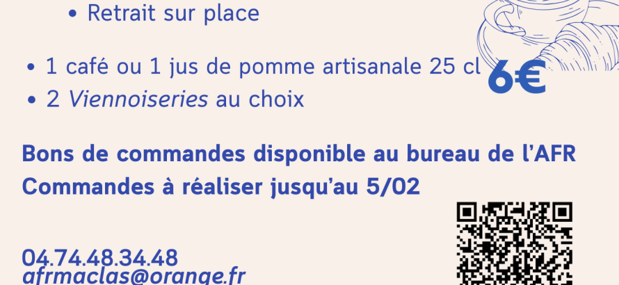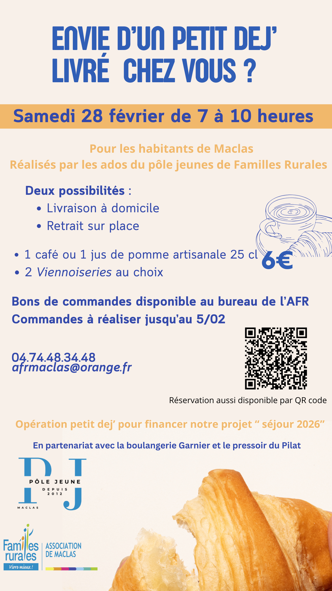 Le samedi 28 février, de 7h à 10h, les ados du Pôle Jeunes de Familles Rurales de Maclas vous proposent un petit déjeuner à déguster chez vous ou à récupérer sur place !