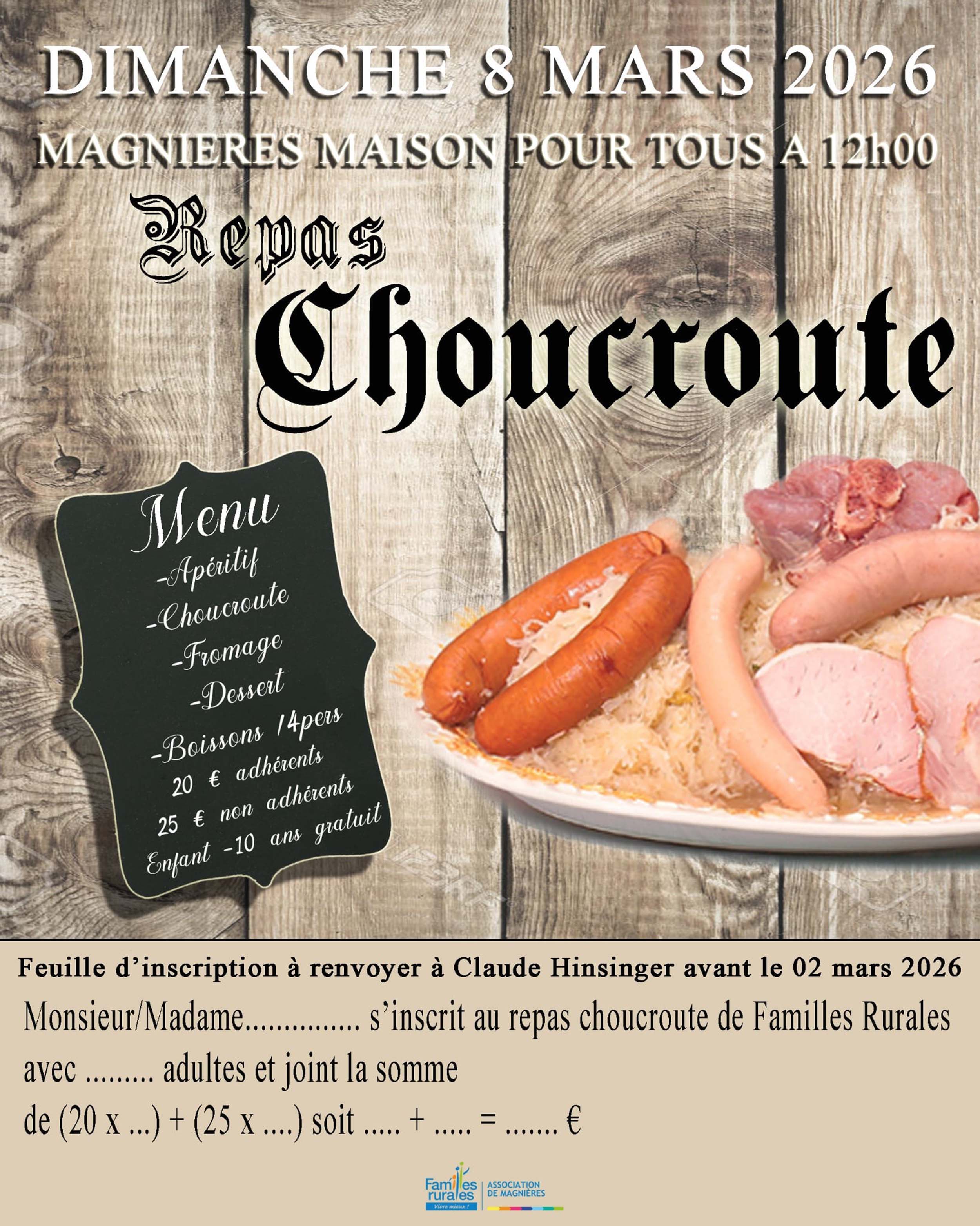 Familles Rurales de Magnières organise son traditionnel repas-choucroute le 8 mars prochain. N'attendez pas pour vous inscrire, les premiers à renvoyer le bulletin d'inscription seront les premiers inscrits . Accès limité à 70 personnes.