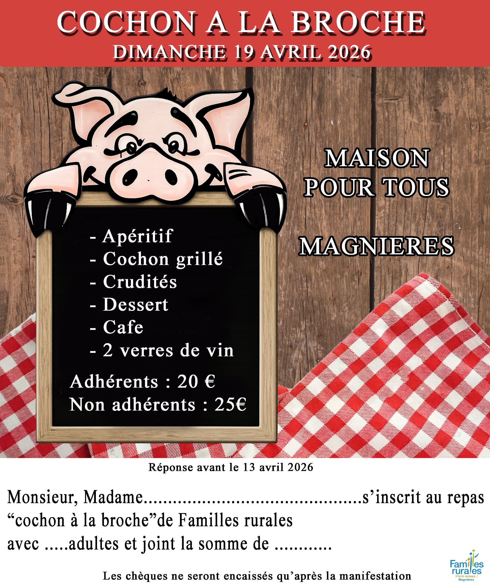 Familles rurales de Magnières organise le 19 avril prochain un repas "cochon" grillé à la broche à la Maison Pour Tous de Magnières. Venez nombreux.