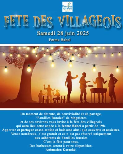 Comme tous les ans Familles Rurales de Magnières organise dans la ferme "Babel" la fête des Villageois façon auberge espagnole chacun apporte ce qu'il a préparé et sa boisson. Un grand moment de partage et de convivialité. La soirée se termine par un karaoké.