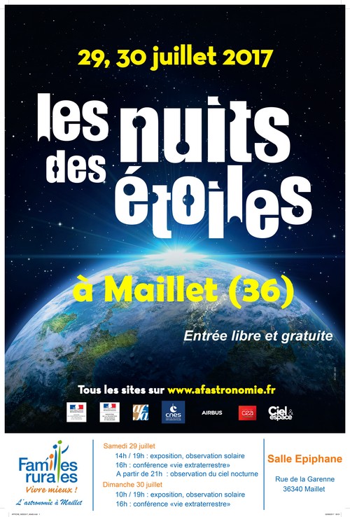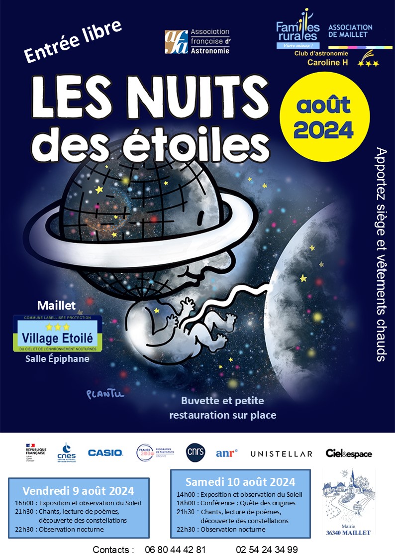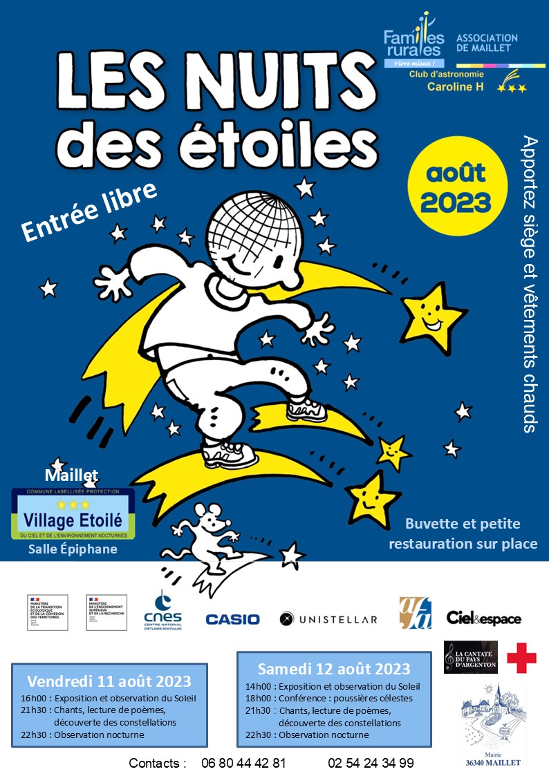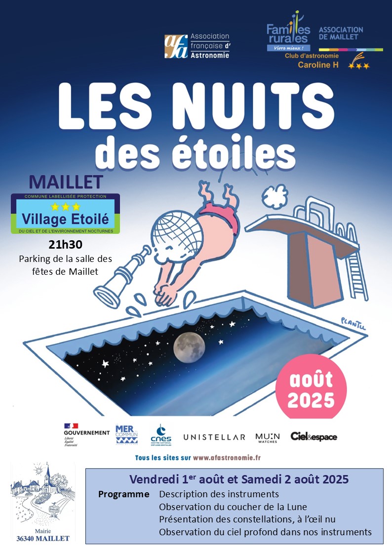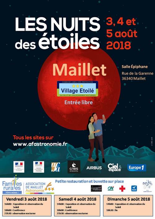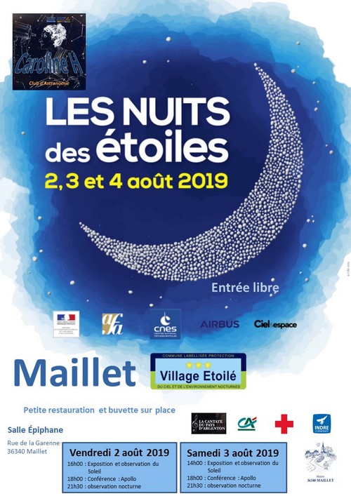 L’association « Familles Rurales » de Maillet participe à cet évènement, grâce au club Caroline H, créé en février 2017 et animé par un astronome amateur titulaire de deux DU d’astrophysique de l’université d’Orsay.