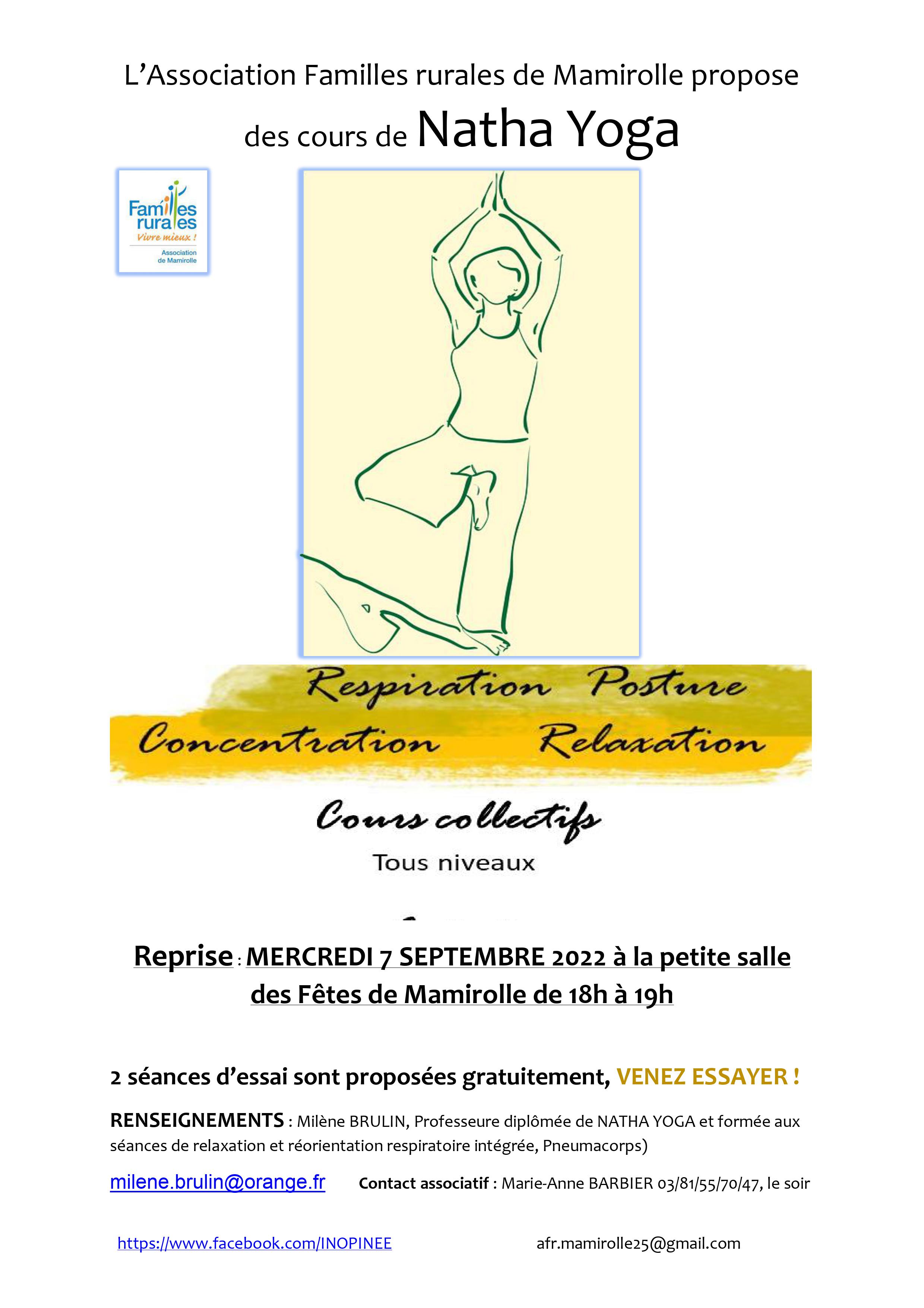Matériel : tapis personnel, mais l'association peut mettre à disposition des tapis, mais aussi des briques et sangles pour les exercices