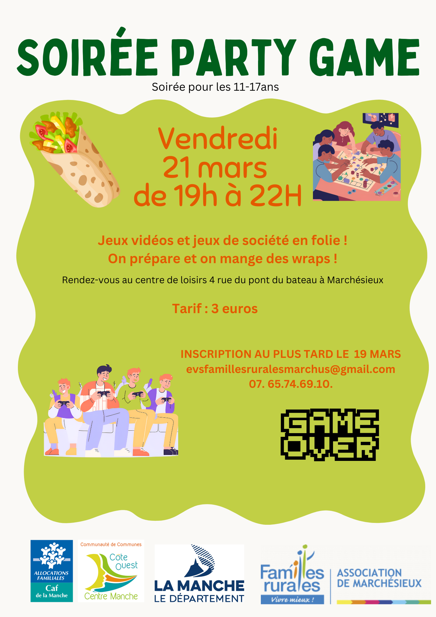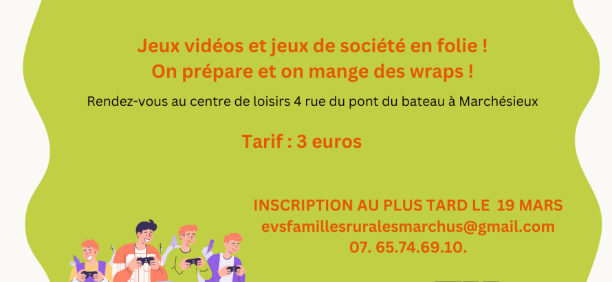 Familles rurales de Marchésieux organise une soirée à destination des adolescents de 11 à 17ans pour une party game le vendredi 21 mars de 19h à 22h à l’accueil de loisirs de Marchésieux.