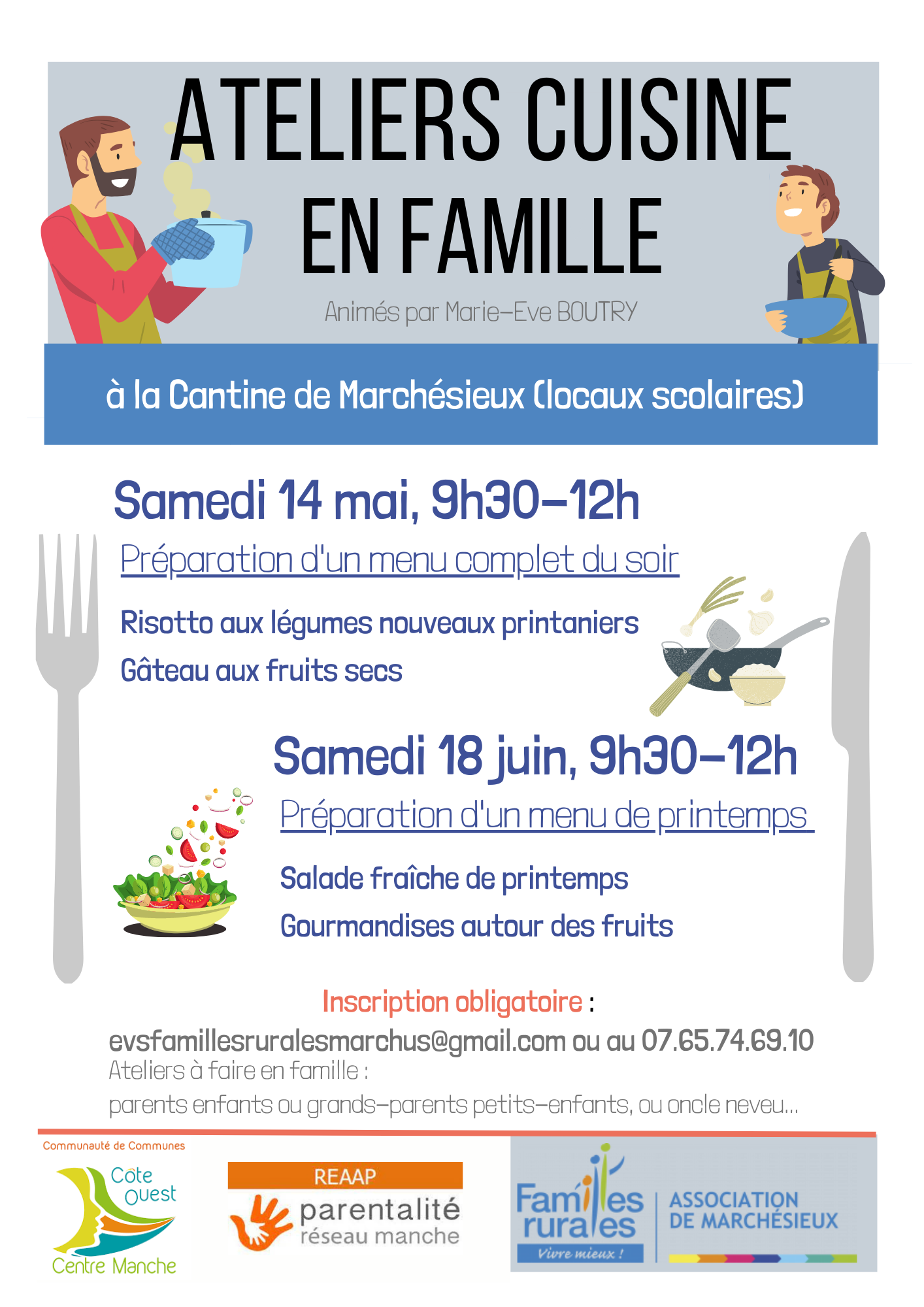 L'association vous propose de partager un moment convivial en famille autour de 2 ateliers cuisine, le samedi 14 mai et le samedi 18 juin.
