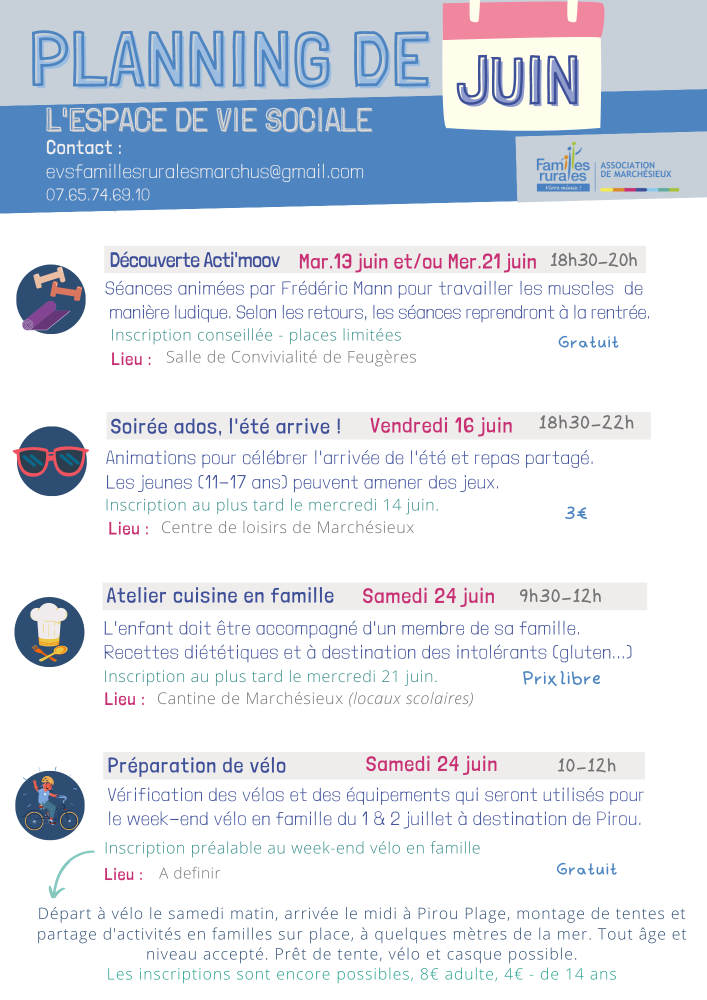 Vous retrouverez en pièce-jointe le programme de L'Espace de Vie Sociale pour le mois de juin qui comprend des séances découverte d'acti'moov, une soirée ados, un atelier cuisine en famille, la préparation du matériel pour le week-end en vélo, une après-midi tournée autour des jeux vidéos ouverte à tous et une soirée loisirs créatifs.