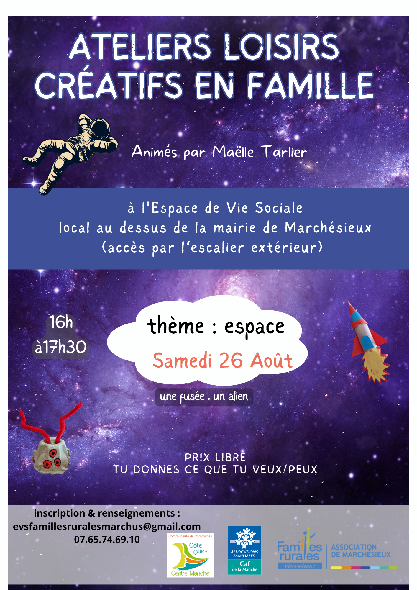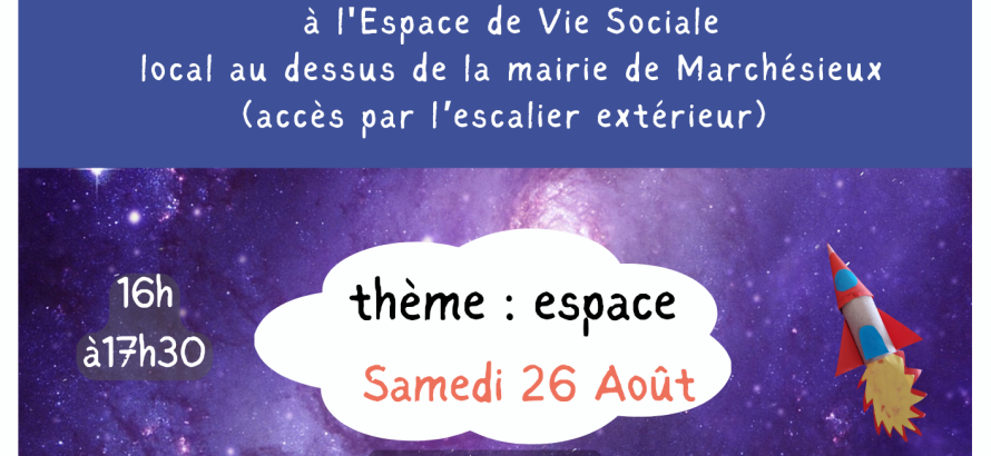 Rendez vous le 26 août de 16h à 17h30/18h à l'espace de vie sociale,local au dessus de la mairie de marchésieux pour un atelier famille sur le thème de l'espace (fusée,Alien).