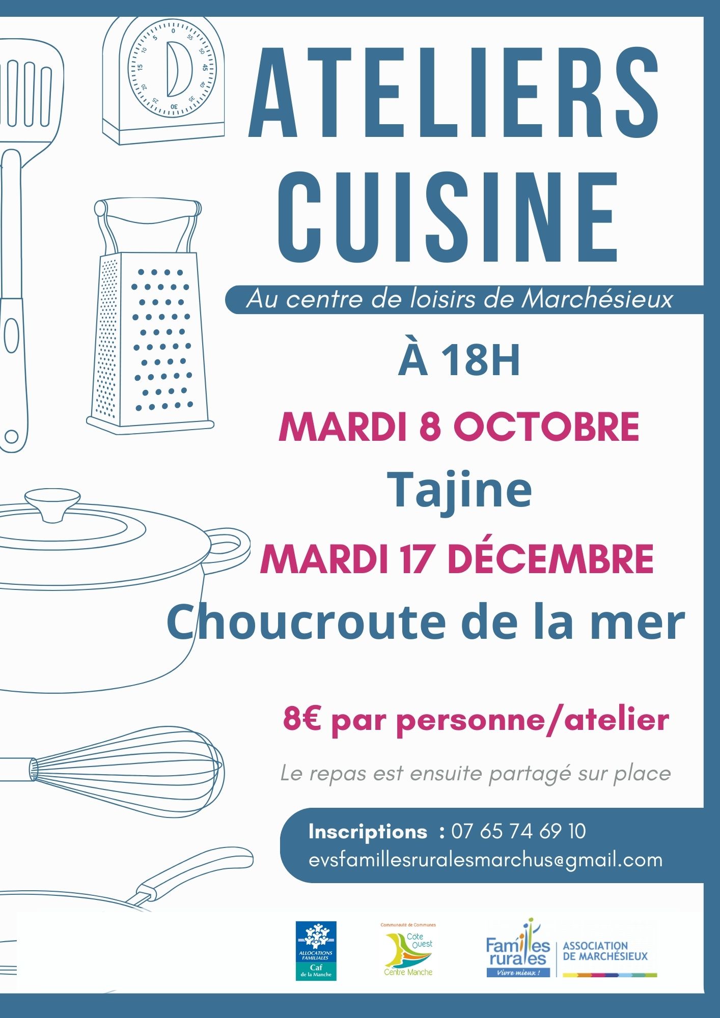 Familles Rurales de Marchésieux organise un atelier cuisine et repas entre adultes le mardi 8 octobre de 18h à 20h.