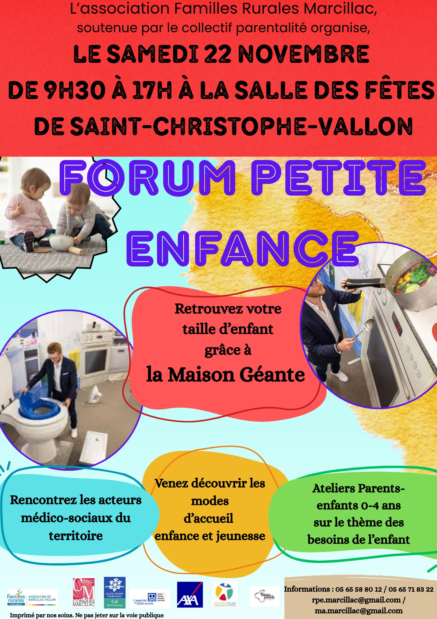 Dans le cadre du collectif parentalité du territoire Conques Marcillac, l’association Familles Rurales de Marcillac organise le Forum Petite Enfance, le samedi 22 novembre 2025, à la salle des fêtes de Saint-Christophe, de 9h30 à 17h.