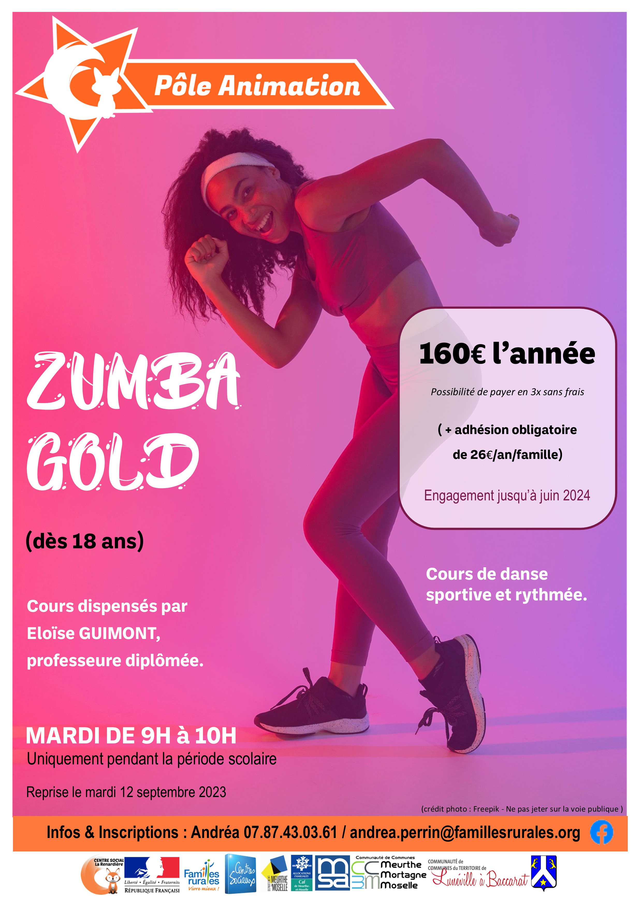 Les inscriptions se font directement auprès d'Andréa au 07.87.43.03.61 ou par mail : andrea.perrin@famillesrurales.org à partir du 28 août 2023.