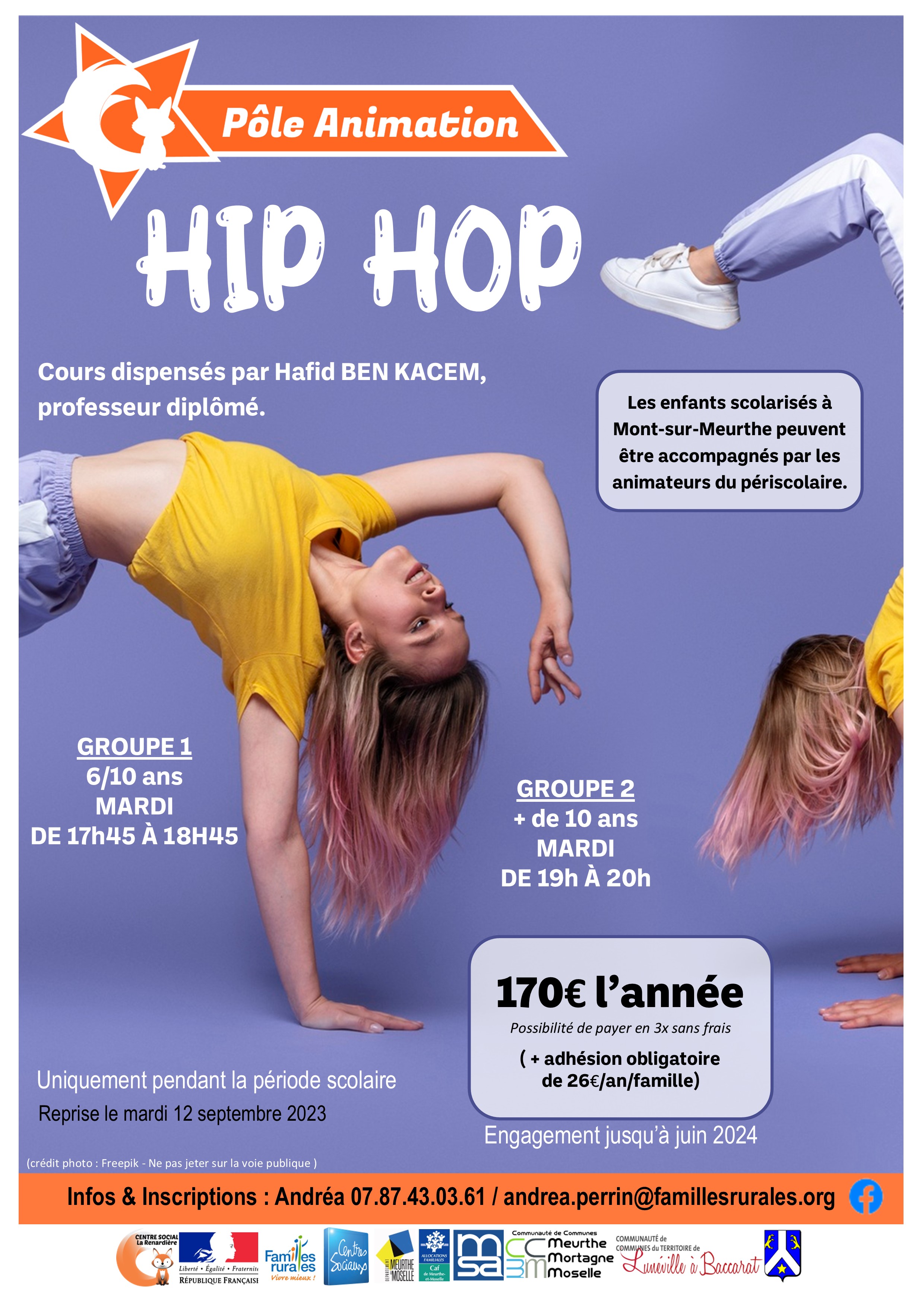 Les inscriptions se font directement auprès d'Andréa au 07.87.43.03.61 ou par mail : andrea.perrin@famillesrurales.org à partir du 28 août 2023.