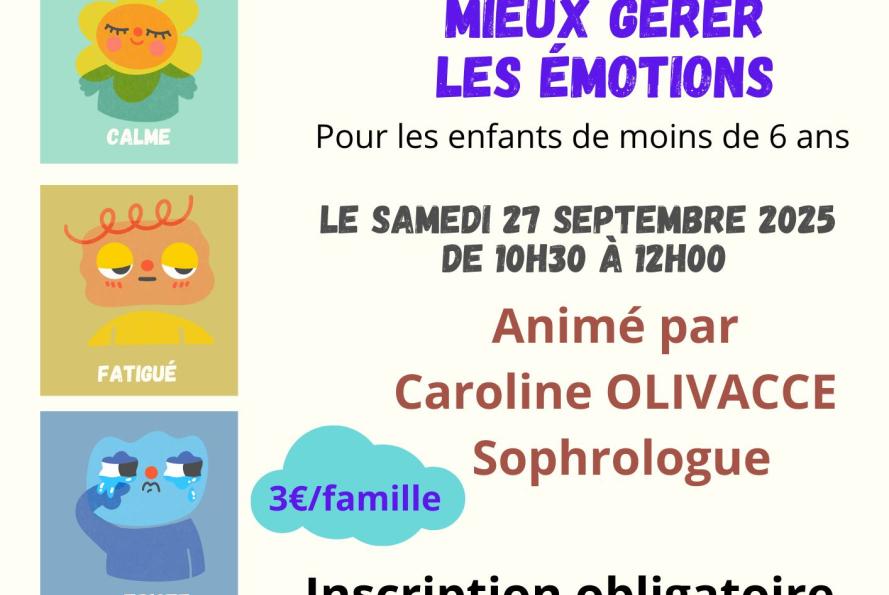 Atelier pratique parent/enfant "Mieux gérer les émotions" pour les enfants de moins de 6 ans, avec Caroline Olivacce, sophrologue, le samedi 27 septembre de 10h30 à 12h. 3€ par famille. Inscription au 02 33 57 16 81 ou aurelie.alliet@famillesrurales.org