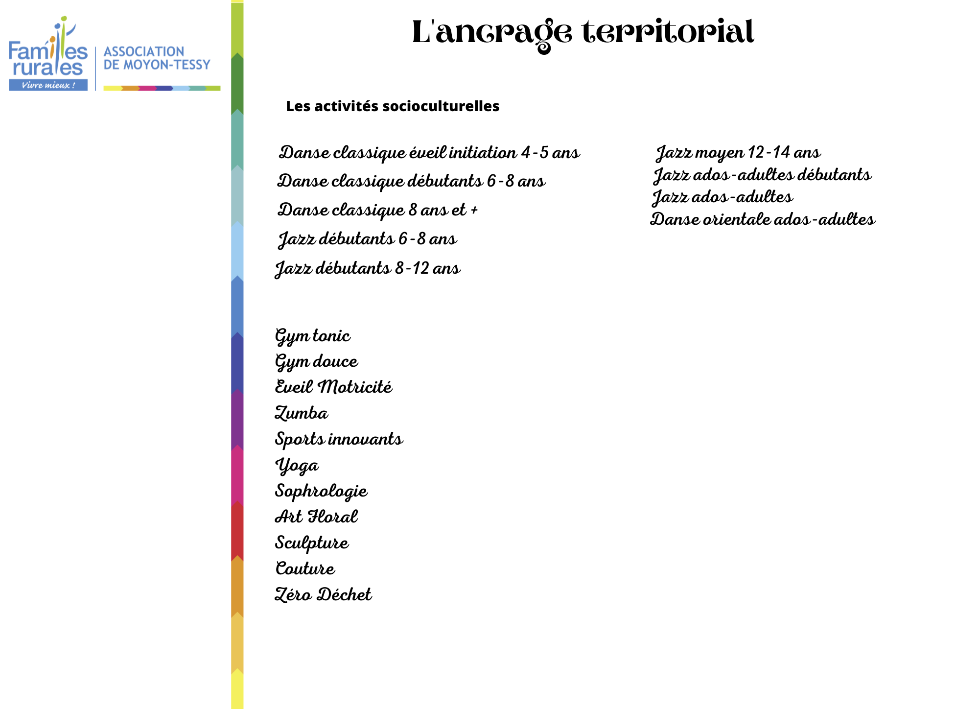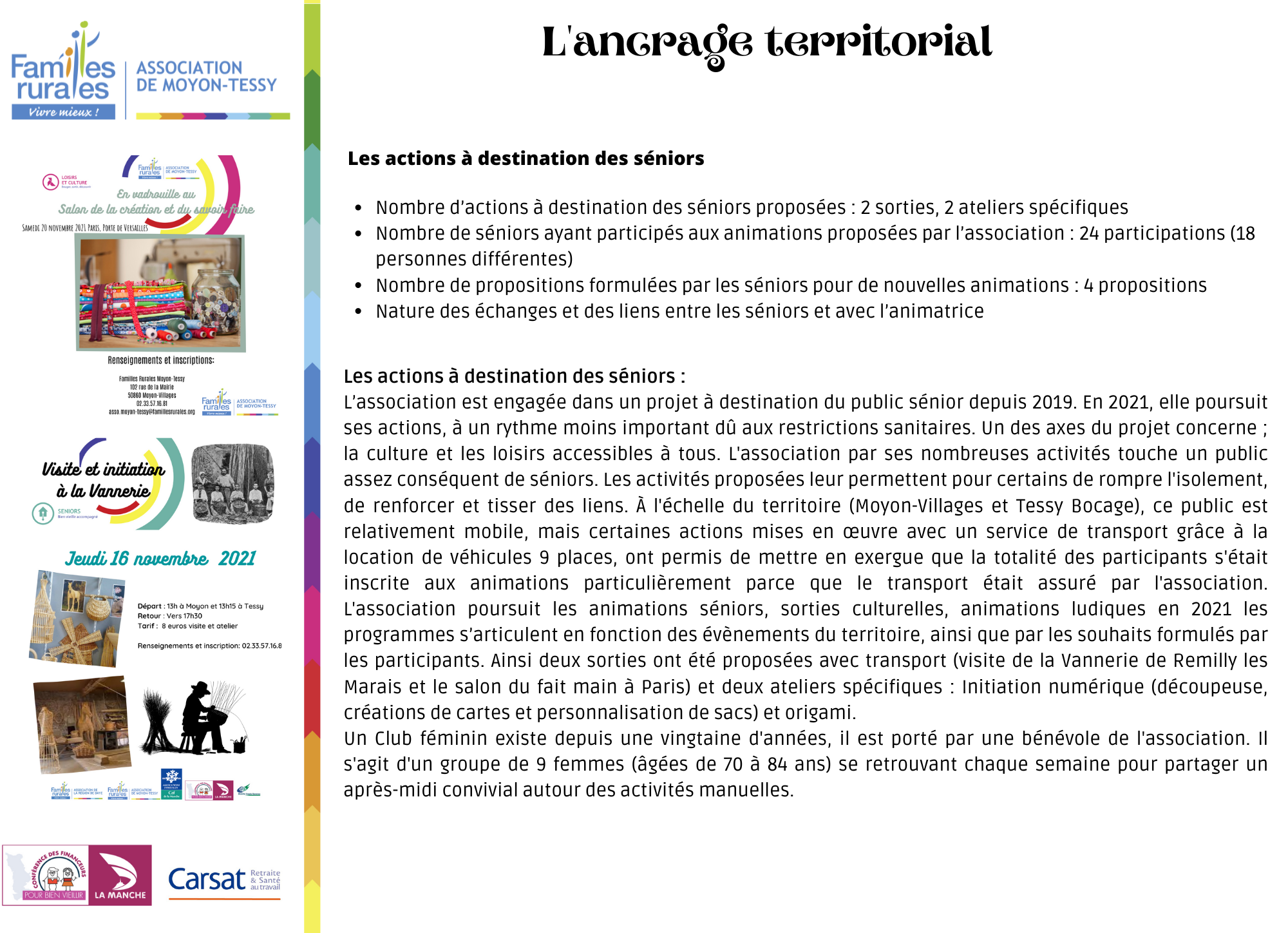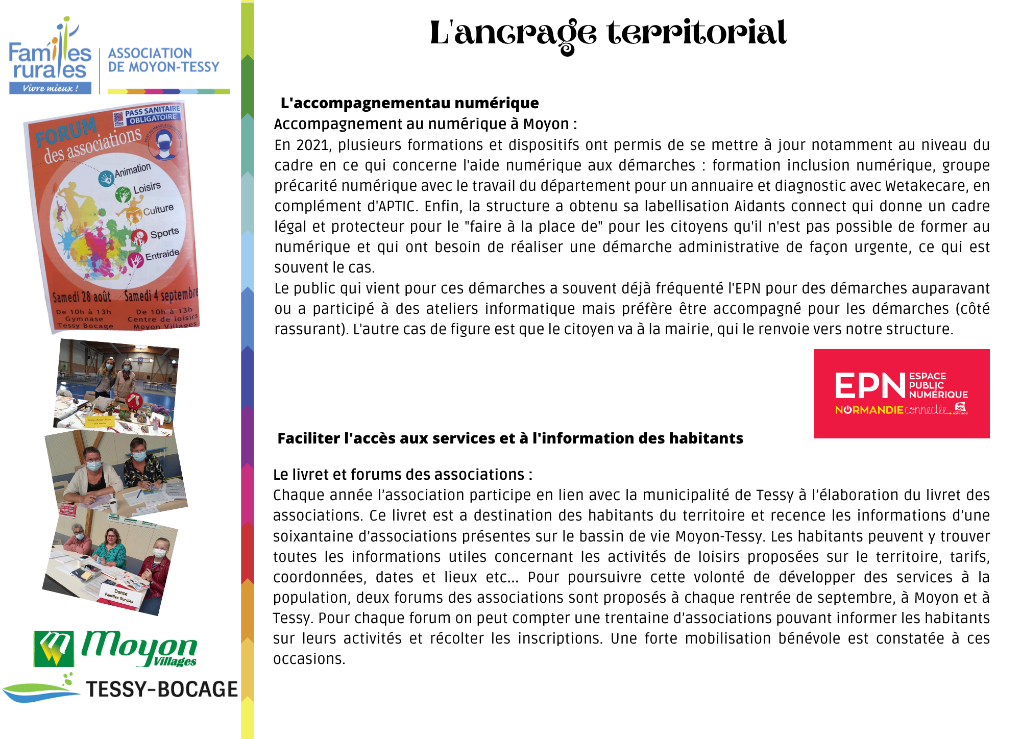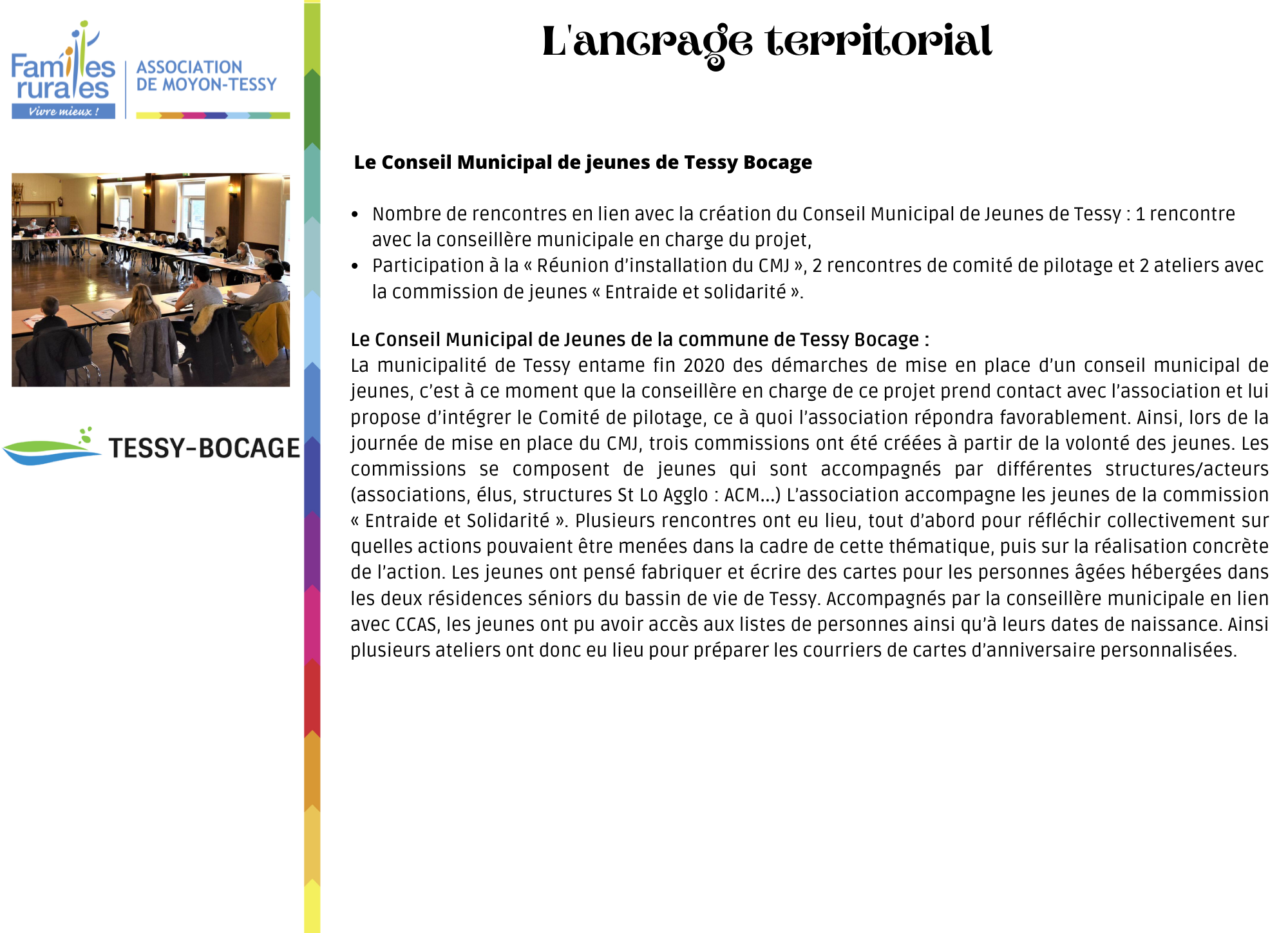 Ancrage territorialAteliers sophrologie et club féminin à TessyPartenariat avec la Mission localeTemps d'animation au collège les jeudis (jeu) et vendredis midis (sport).
