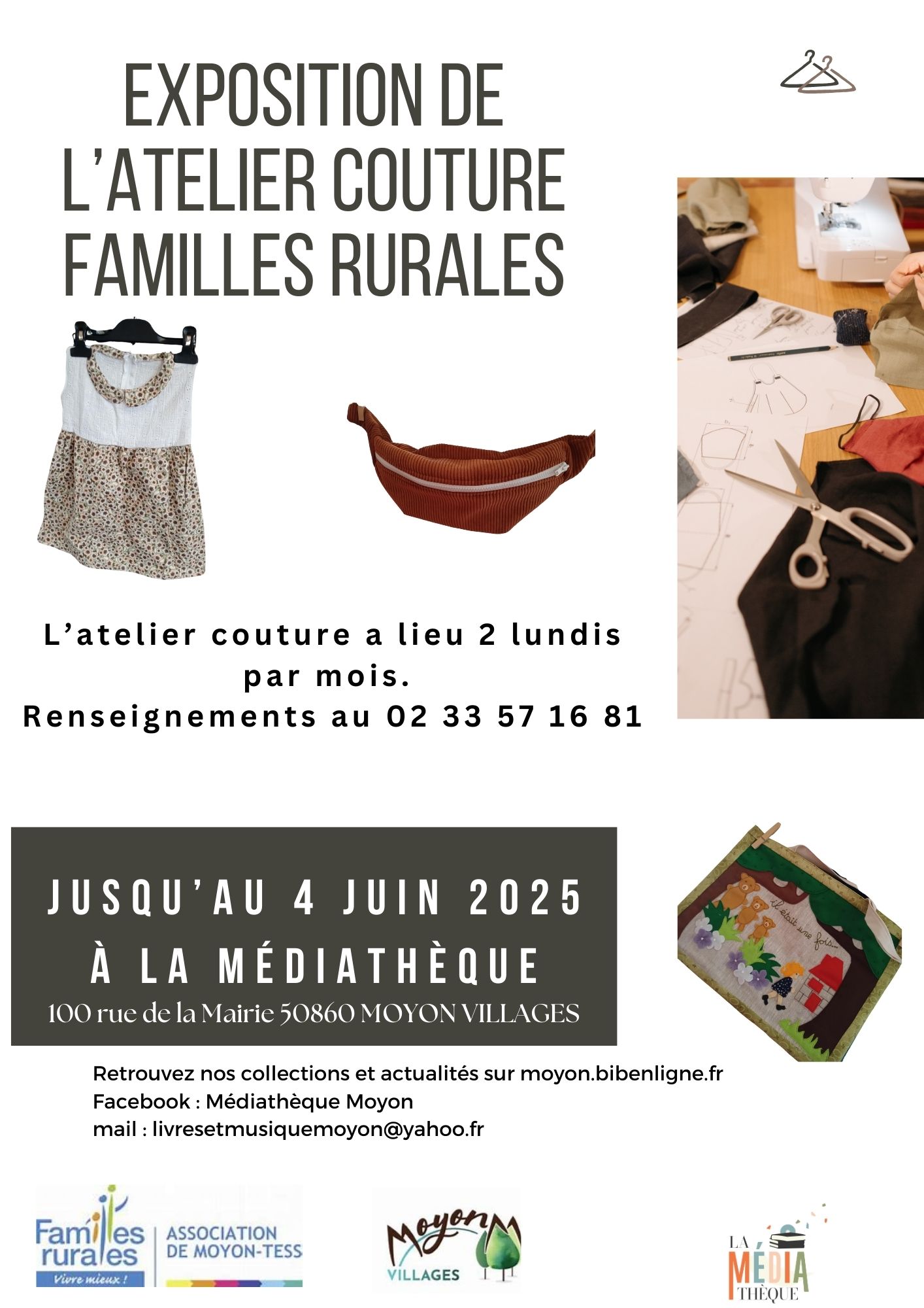 Les élèves de l'atelier couture du lundi exposent leurs créations à la Médiathèque de Moyon jusqu'au 4 juin. N'hésitez pas à aller voir lors des heures d'ouverture : lundi 16h-18h, mercredi 10h-12h30 et 13h30-16h, vendredi 10h-13h et 16h30-18h30 et samedi 10h-13h.