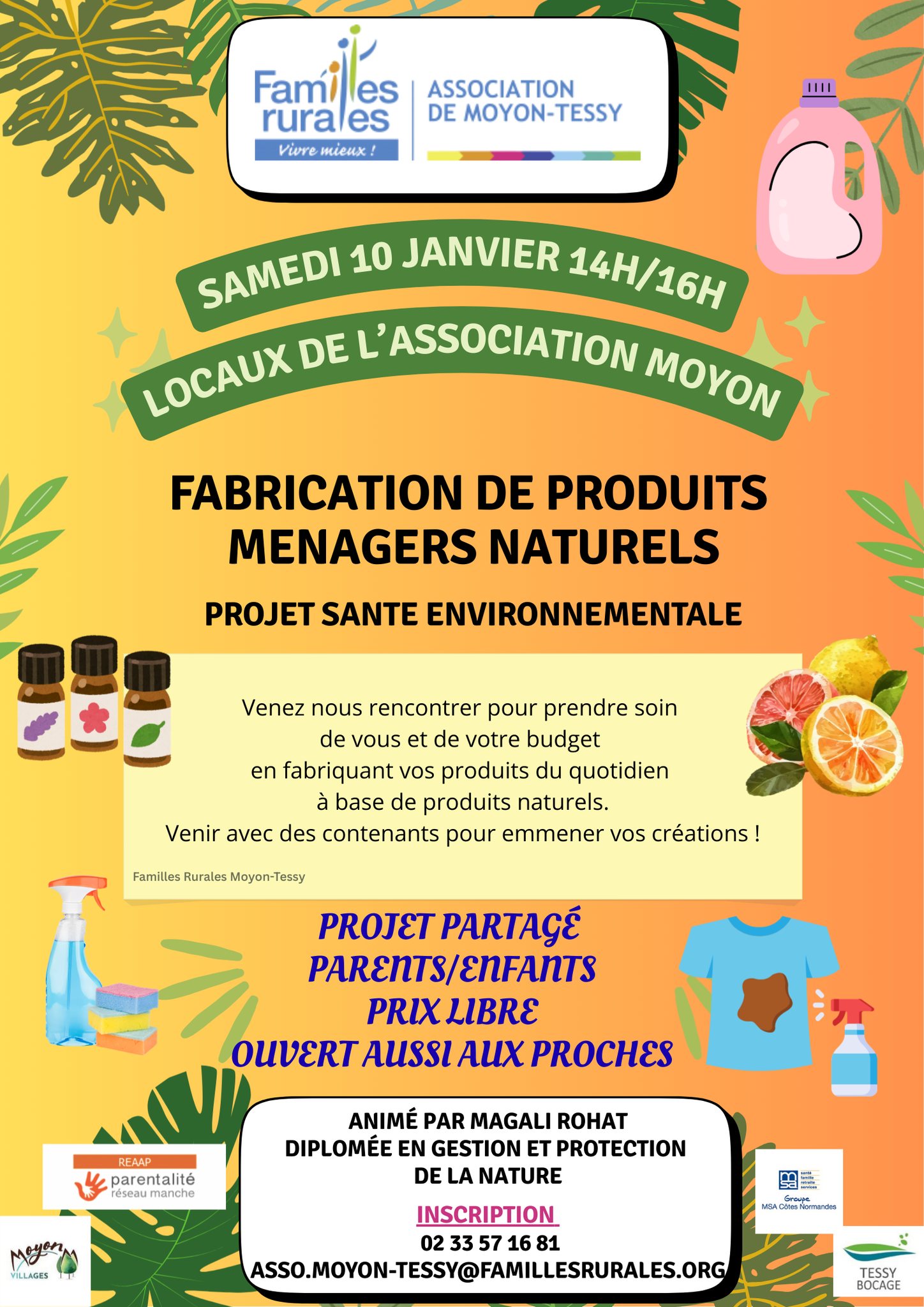 Atelier parent/enfant fabrication de ménagers naturels le samedi 10 janvier de 14h à 16h à Moyon.Prix libre. Apportez vos contenants. Animation Magali Rohat, diplômée en gestion et protection de la nature. Inscription au 02 33 57 16 81