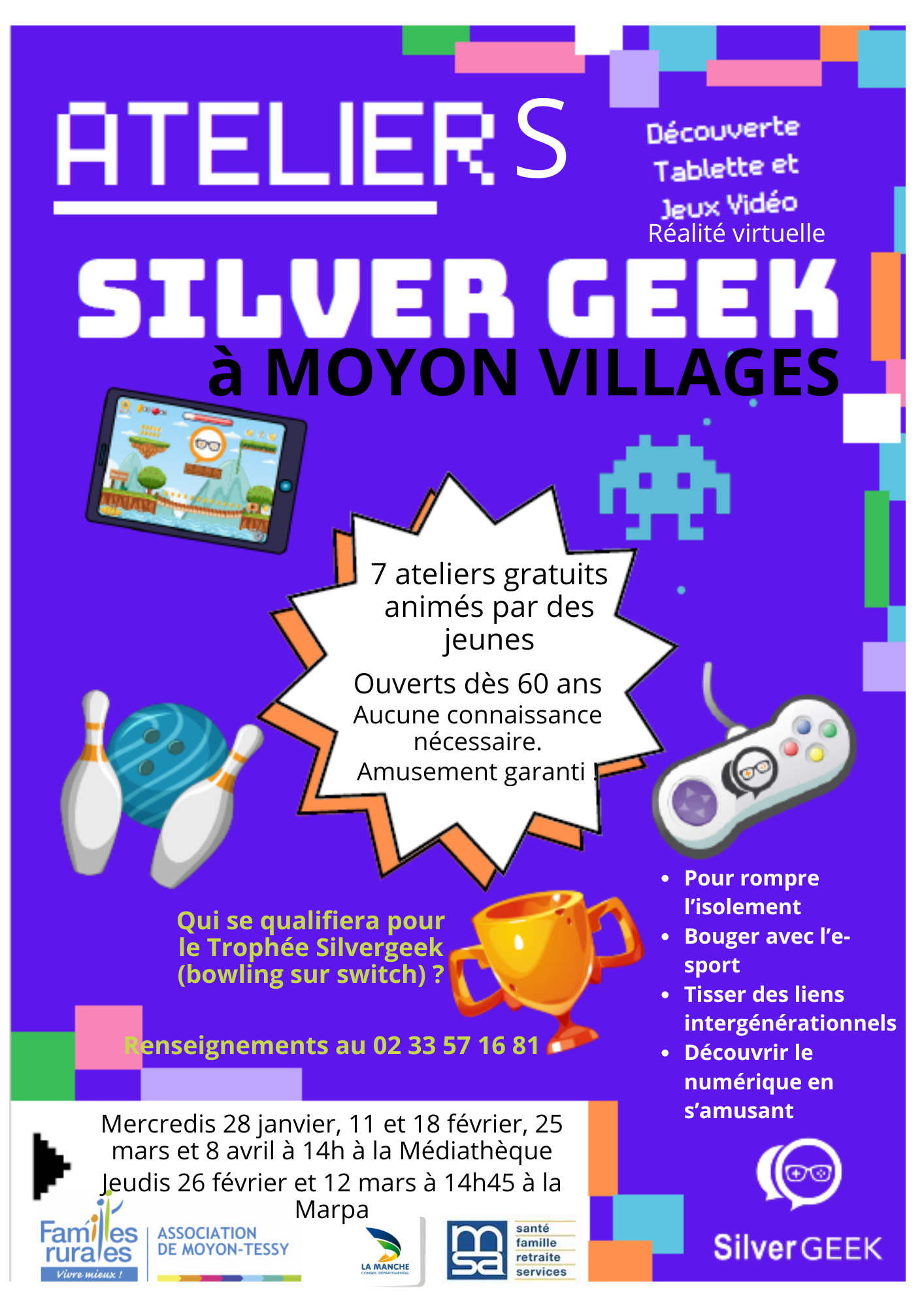 La 1ère séance aura lieu à la médiathèque le mercredi 28 janvier à 14h. N'hésitez pas à venir et si vous ne pouvez pas, parlez-en autour de vous. Le but est de s'amuser, rompre l'isolement, bouger, tisser des liens intergénérationnels.