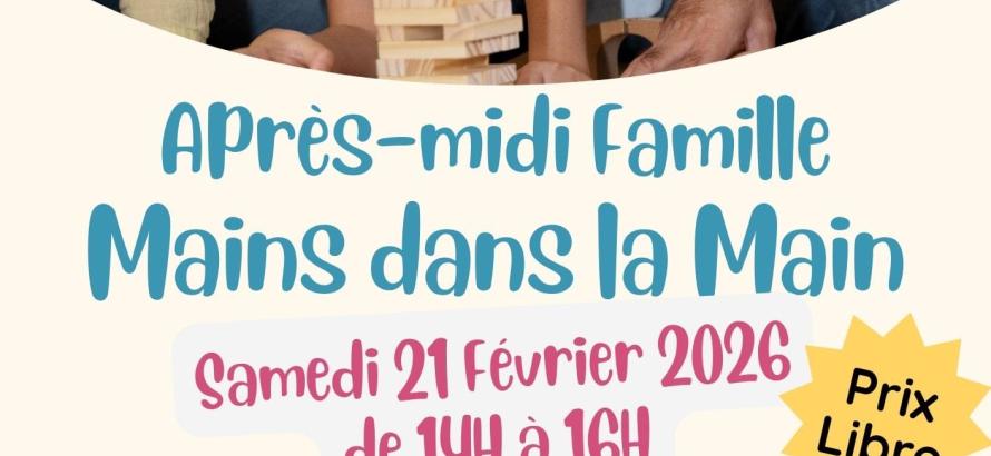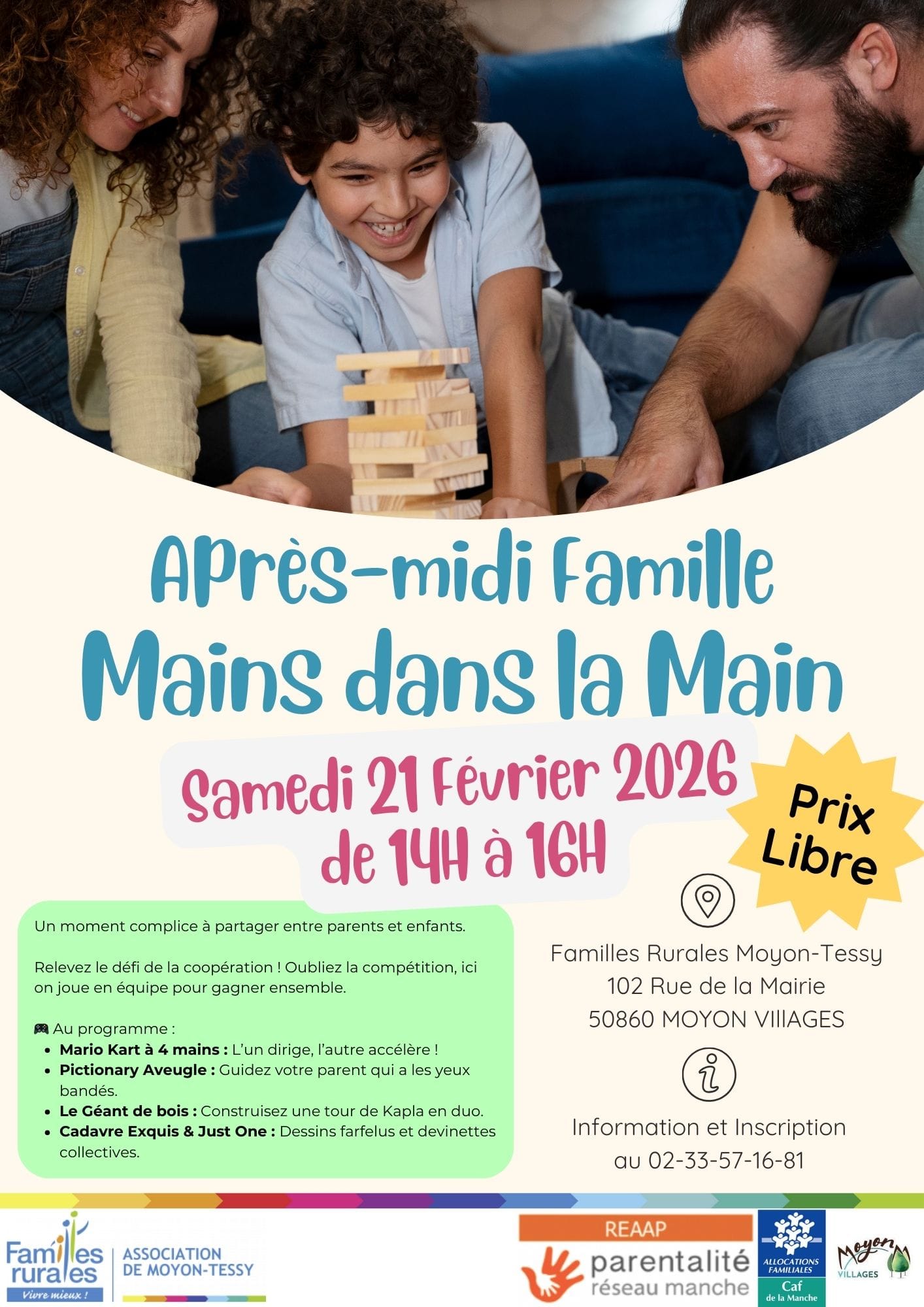 Samedi 21 février de 14h à 16h, l'association Familles Rurales Moyon-Tessy organise dans ses locaux une après-midi jeux "main dans la main". Le principe : venir en binôme parent/enfant et jouer à Mario Kart, Pictionary aveugle, tour de kapla en duo et jeux cadavre exquis et just one. Prix libre. Inscription au 02 33 57 16 81.