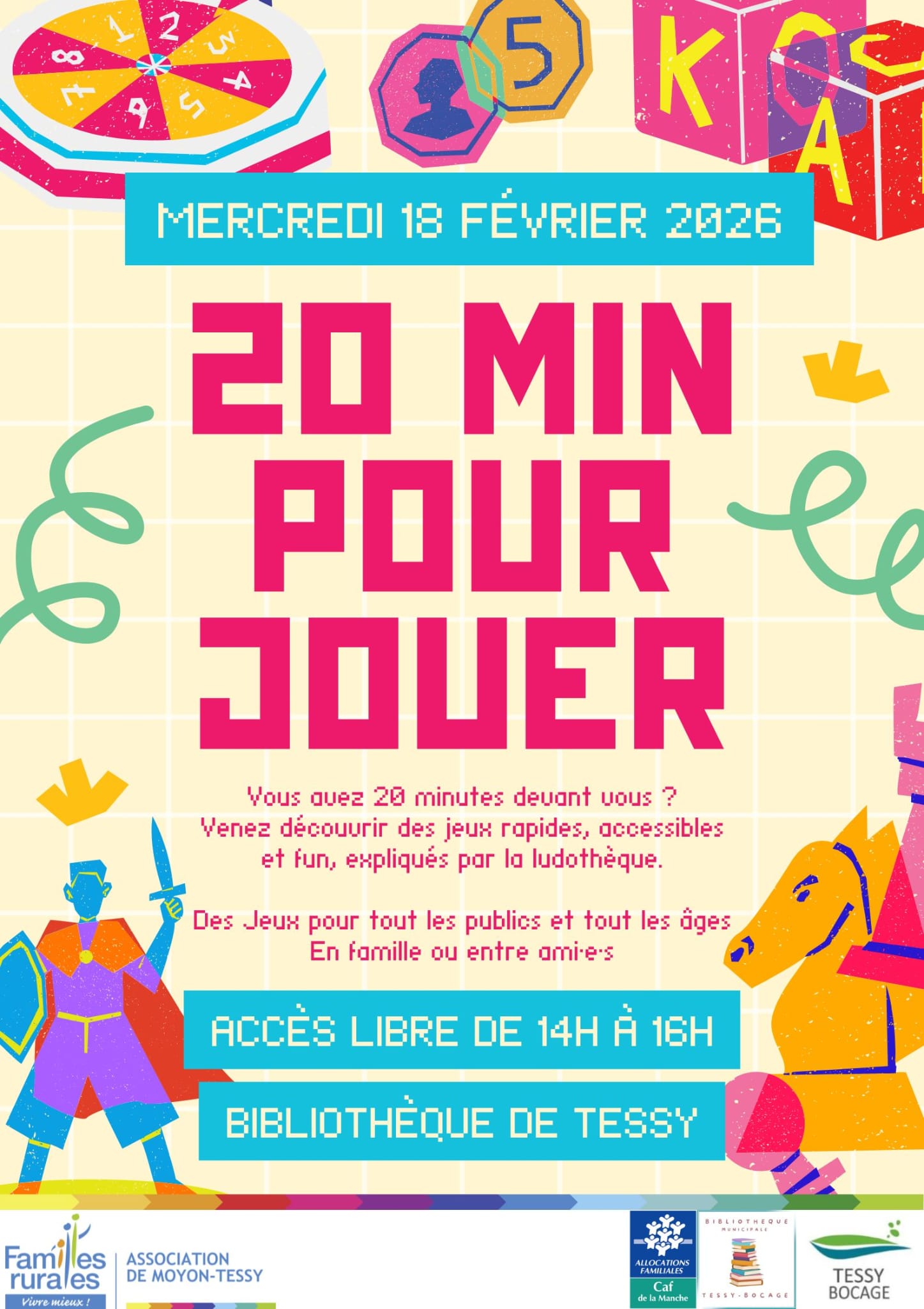 Animation de 14h à 16h à la bibliothèque de Tessy avec des jeux d'une durée de 20 minutes. 15 février 2026 au 18 février 2026