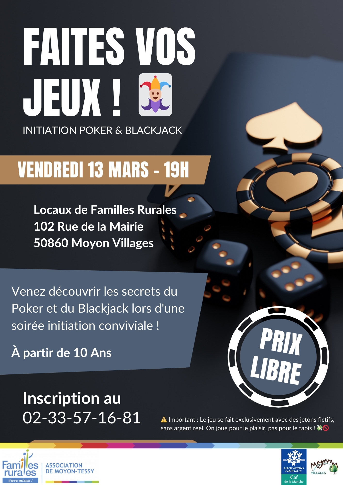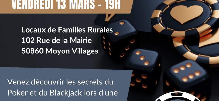 Initiation au poker et blackjack (sans argent) le vendredi 13 mars de 19h à 21h à partir de 10 ans. Dans les locaux de l'association. Prix libre. Inscription obligatoire au 02 33 57 16 81.
