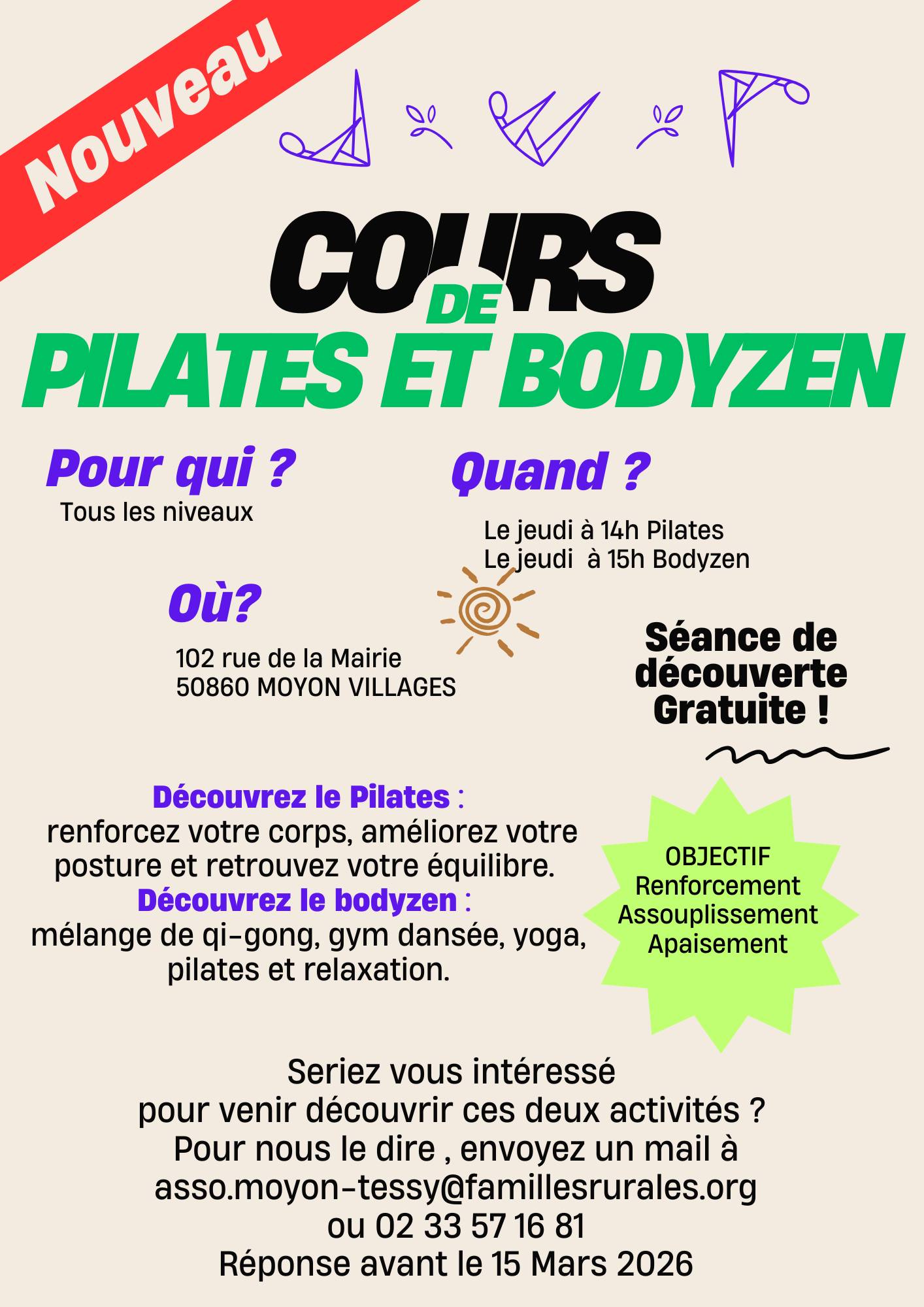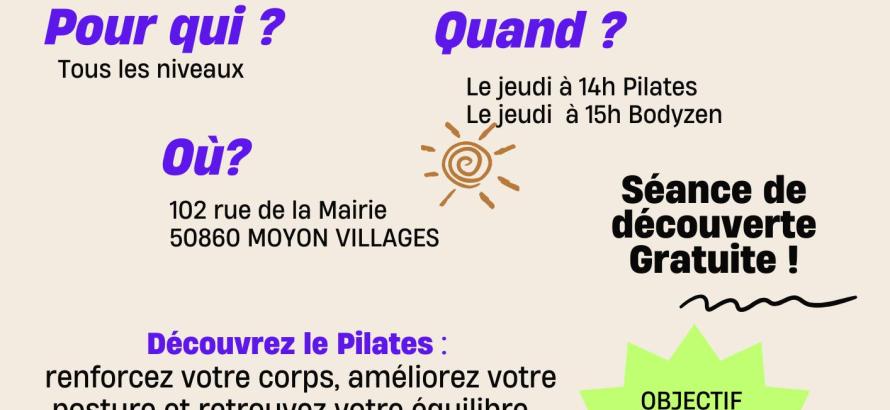 Séance d'essai de pilates à 14h (complet) et bodyzen (15h) le jeudi 9 avril dans nos locaux. Inscription au 02 33 57 16 81 30 mars 2026 au 9 avril 2026