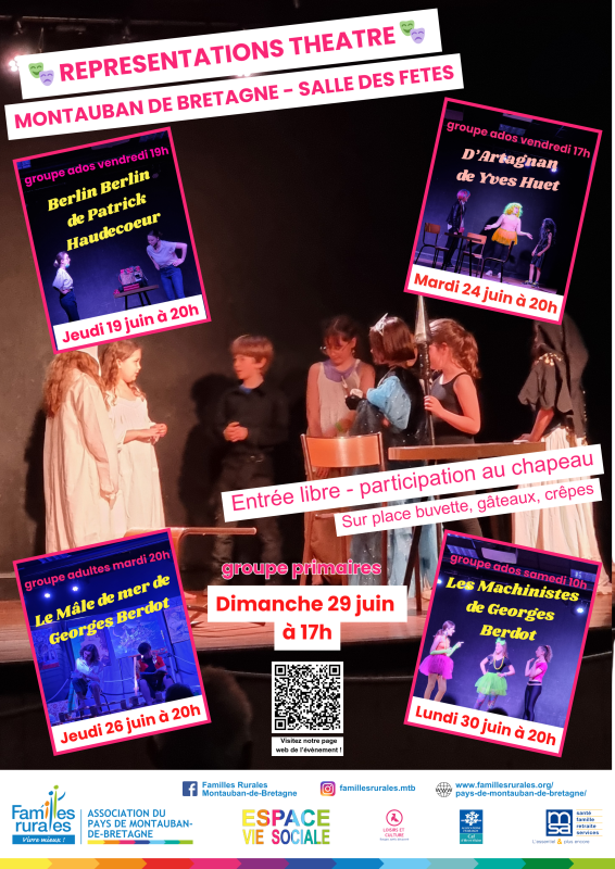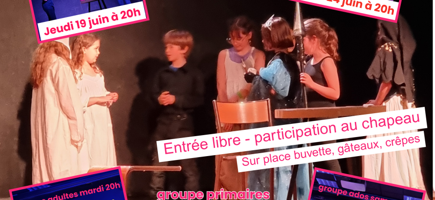 Plongez dans un monde d'émotions, de rires et d'histoires captivantes avec les troupes de théâtre enfants et adultes qui vous invitent à découvrir le fruit de leur travail de toute une année. Émerveillez-vous devant le talent, la passion et la créativité de ces artistes qui ont mis tout leur cœur dans des représentations uniques et mémorables. Venez pour une expérience théâtrale inoubliable, où chaque acte est le résultat d'un engagement inébranlable et de nombreuses heures de préparation. Joignez-vous à nous et laissez-vous transporter par l'art magique du théâtre, incarné par ces troupes dévouées.