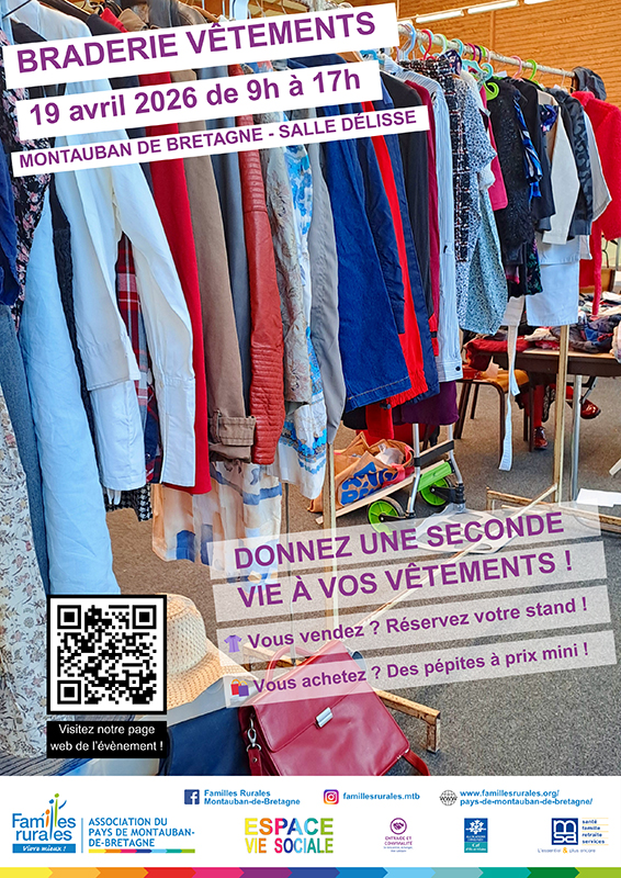 Il s'agit d'une vente de vêtements d'occasion enfants, ados, hommes et femmes par des particuliers. Chaque exposant vend ses propres vêtements. 69 exposants seront présents pour vendre leurs vêtements, chaussures... Une table d'1,80 mètre, un portant d'1,50 mètre et chaises sont fournis pour 34 places et une table d'1,80 mètre avec un espace vide à coté pour 35 places. Il y a une possibilité d'avoir des cintres sous cautions (2€ de caution pour 10 cintres)