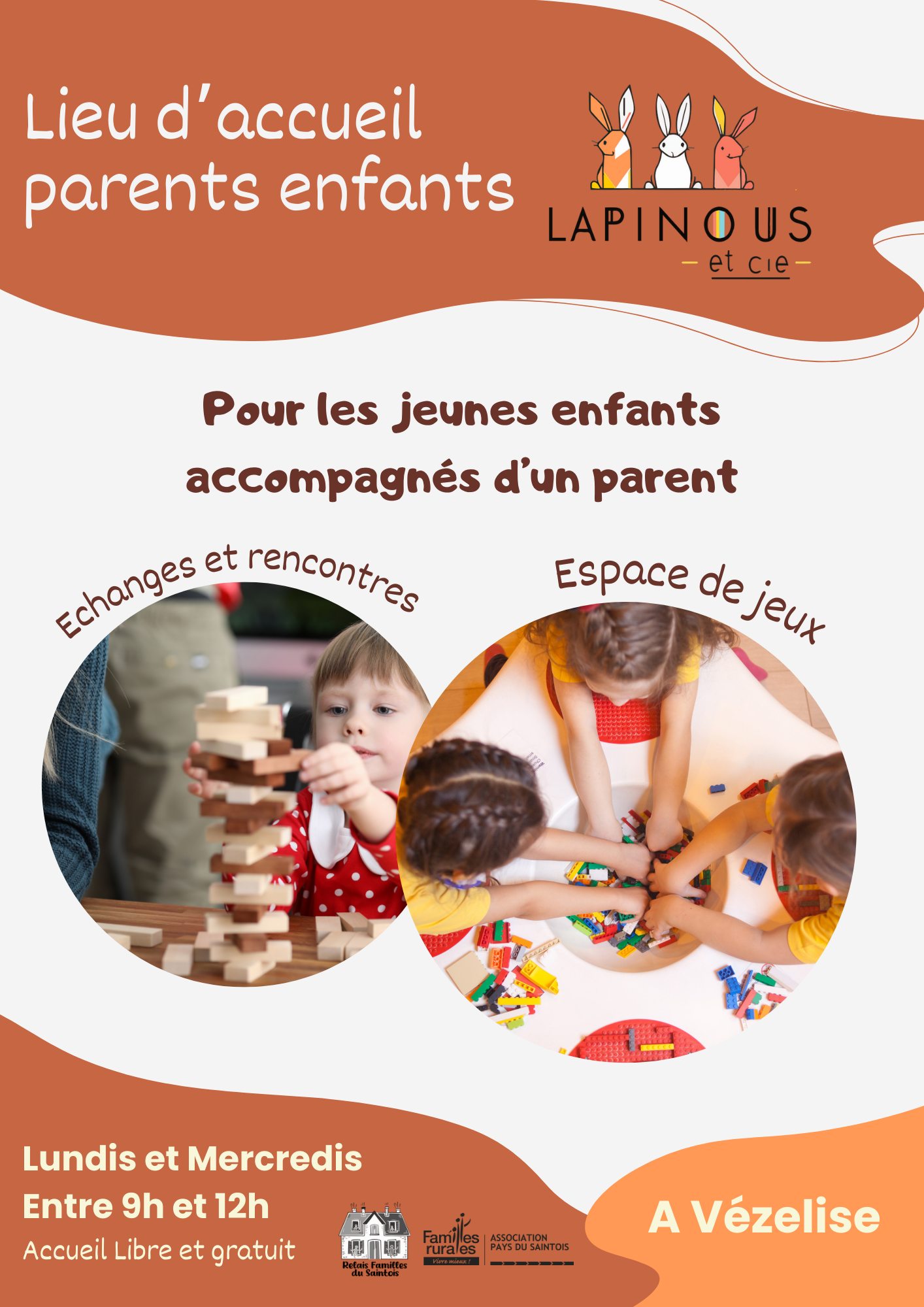 Espace de jeux, de rencontres, d’échanges, et de détente où sont accueillis conjointement l’enfant de moins de 6 ans et un parent (son parent, un grand parent, une marraine…). Les futurs parents sont les bienvenus.