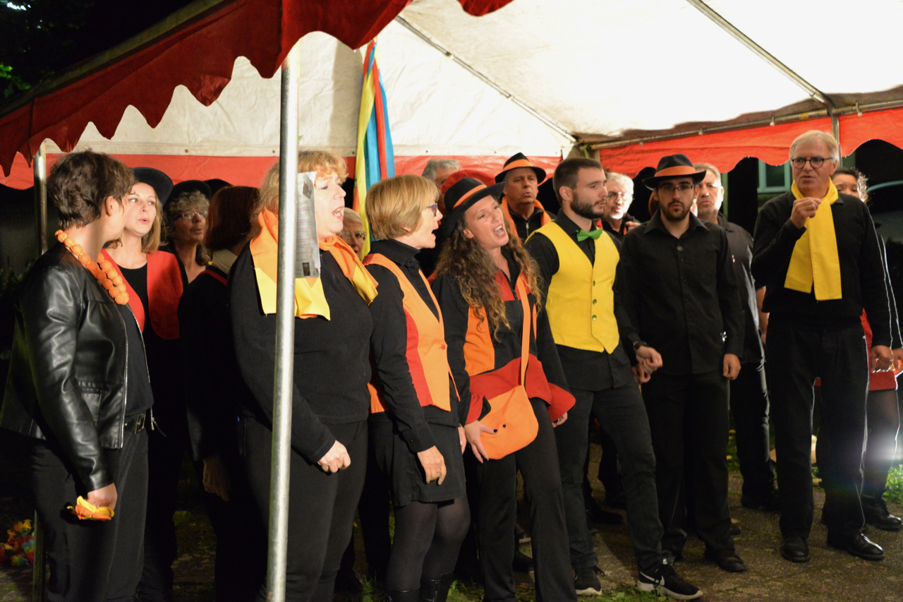 L’après-midi, la compagnie de théâtre Roue Libre a présenté au public son spectacle « Caracordage ». La compagnie a également installé dans la salle l’ancien manège de chevaux de bois des Magasins Réunis de Nancy pour le plus grand bonheur des petits qui chevauchaient et des plus grands qui pédalaient. De nombreuses autres animations ont été mises en place : initiation à la pétanque, poterie, calligraphie, expositions photos, diffusion de films courts sur les activités des associations et de l’accueil périscolaire. Un « Tacotmaton » était à disposition des visiteurs et bénévoles afin de se photographier sur une caisse à savon ayant participé au dernier « Family Tacots » de Loisy. Durant l’apéritif offert par le PEL, les choristes des Hurteloups de Loisy sont montés sur scène afin d’offrir leur concert. Le repas préparé et servi par BHL Gastronomie, un traiteur d’Atton, a été partagé dans une ambiance des plus chaleureuses, notamment grâce à Vincent, un fidèle bénévole qui a animé la soirée.
